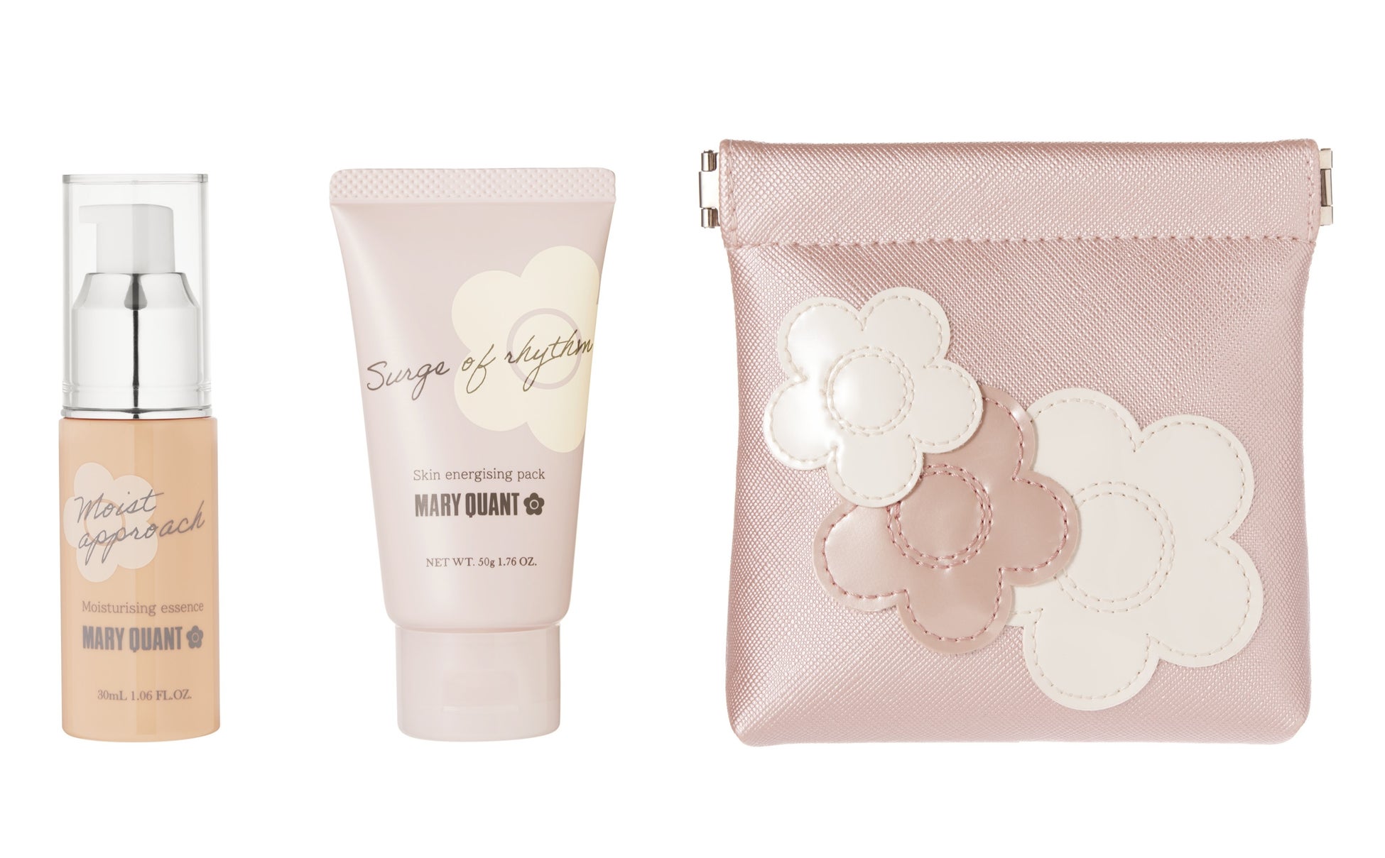 『モイスト アプローチ』(現品サイズ)、『サージ オブ リズム』(ハーフサイズ)、『レイヤード デイジー バネクチポーチ』のセット。すべて、同時発売のカプリシャスをイメージした限定デザインです。