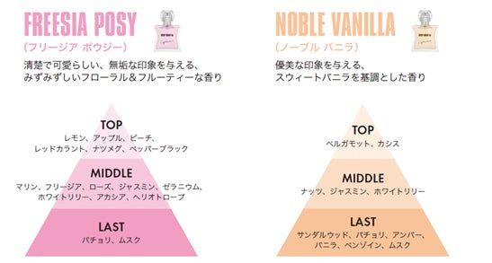 2つの香りを重ねてつけることで、フローラルバニラ調の優しい甘さの香りが楽しめます。
