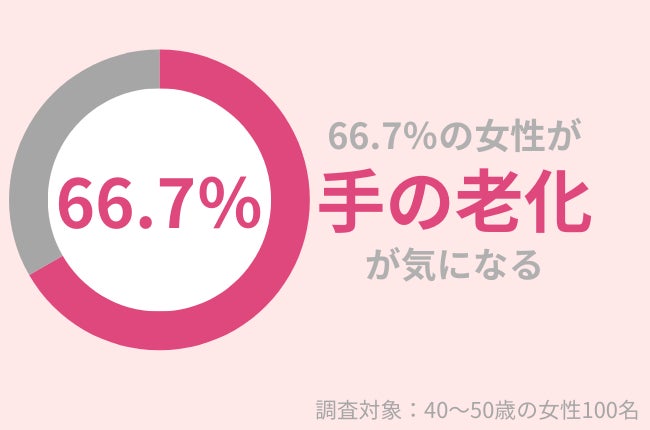 調査の結果、40代女性のうち、66.7%の方が「手の老化」が気になっていることがわかりました。乾燥やシワ、シミ、血管の目立ちなど、様々な症状により、手が老けて見えることがあります。手は他人からも自分からもよく見える部位なので、若々しく健康的でいたいという願望を持つ方が多いです。