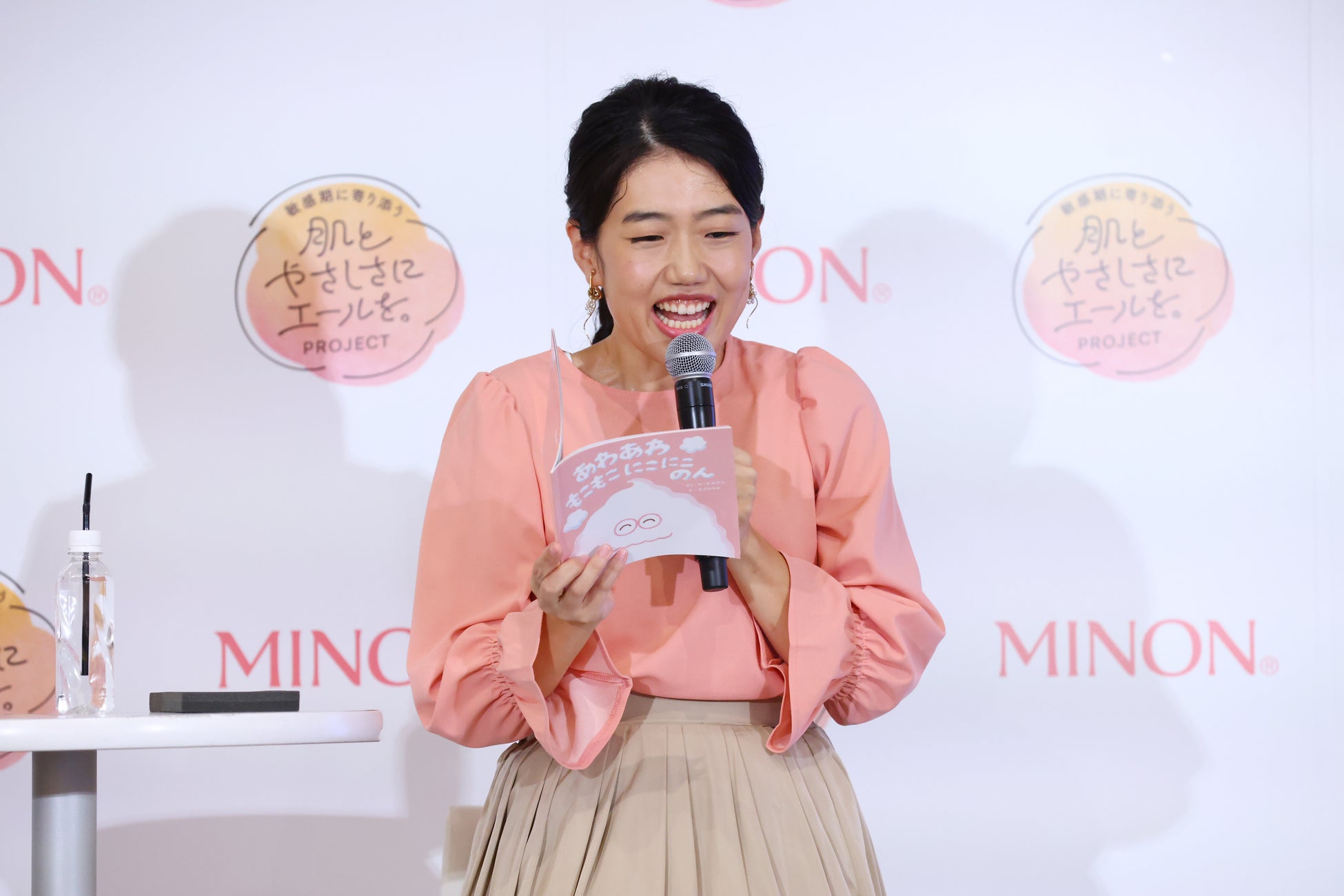 昨年ミノンブランドが50周年を迎えた際、お子さまやそのご家族へ肌ケアの大切さを楽しみながら学んでいただけるように、オリジナル絵本『あわあわ もこもこ にこにこ のん』を制作。当日は横澤さんにこちらの絵本を読み聞かせいただきました。普段からお子さまに読み聞かせしているという横澤さんは、慣れた様子で来場した子どもたちへ語り掛けるように絵本を読んでいただきました。読み聞かせを終えた横澤さんは「すごい緊張で汗だくになっちゃって、今私がお風呂に入りたくなっちゃいました」と一言。絵本のやわらかくやさしいタッチのイラストも気に入られた様子でした。