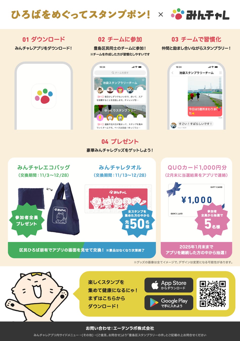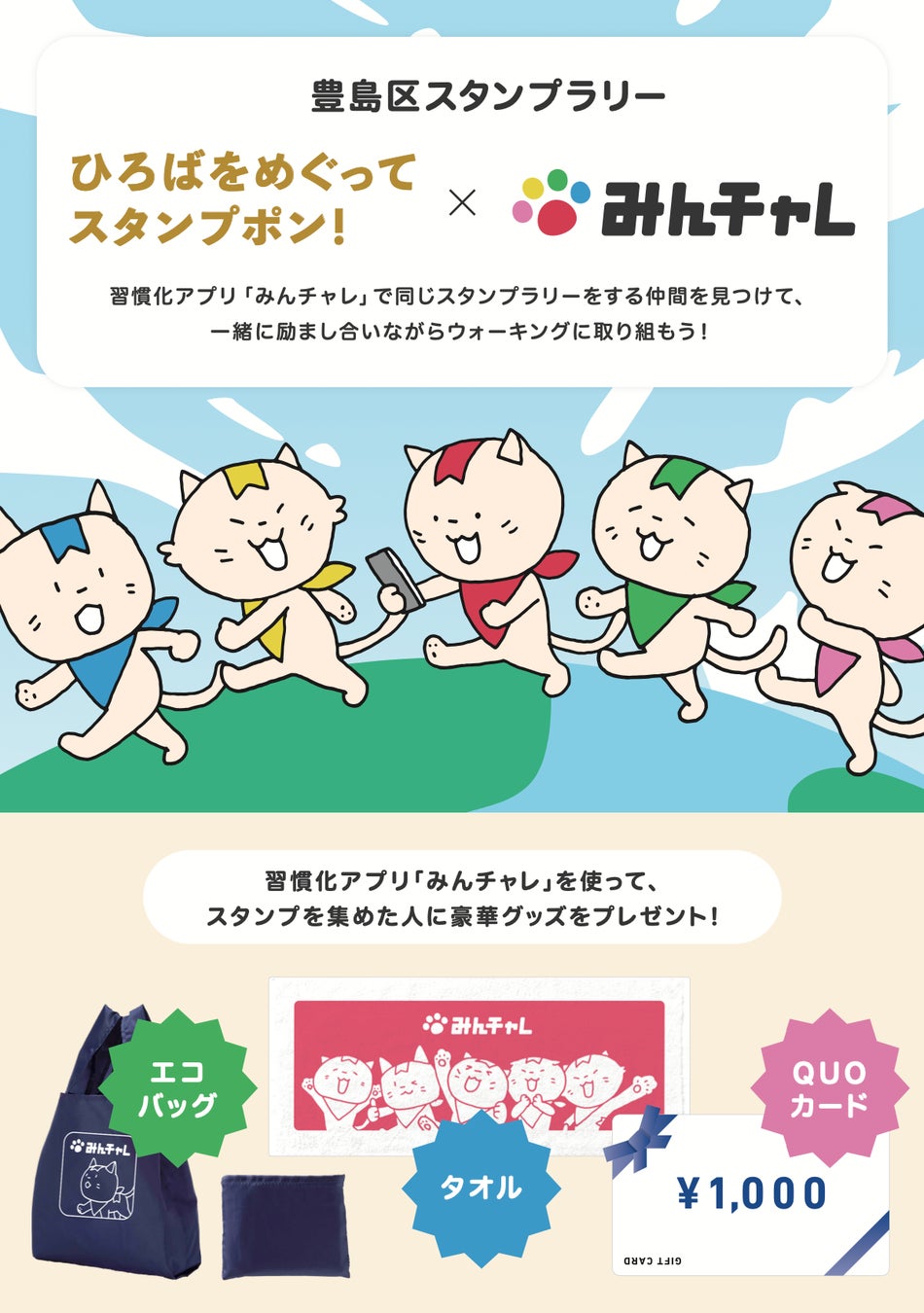東京都豊島区(区長:高際 みゆき)と習慣化アプリ「みんチャレ®︎」を開発するエーテンラボ株式会社(東京都中央区 代表取締役:長坂 剛)は、11月5日より豊島区の区民ひろばで行うスタンプラリー企画「つなぐ・つながる・ひろばのWA!スタンプラリー ひろばをめぐってスタンプポン!」と習慣化アプリ「みんチャレ」のコラボイベントを開催します。習慣化アプリ「みんチャレ」でスタンプラリーをする仲間を見つけて、一緒に励まし合いながらウォーキングに取り組みます。参加者にはスタンプラリーの達成状況に応じて、オリジナルみんチャレグッズがプレゼントされます。