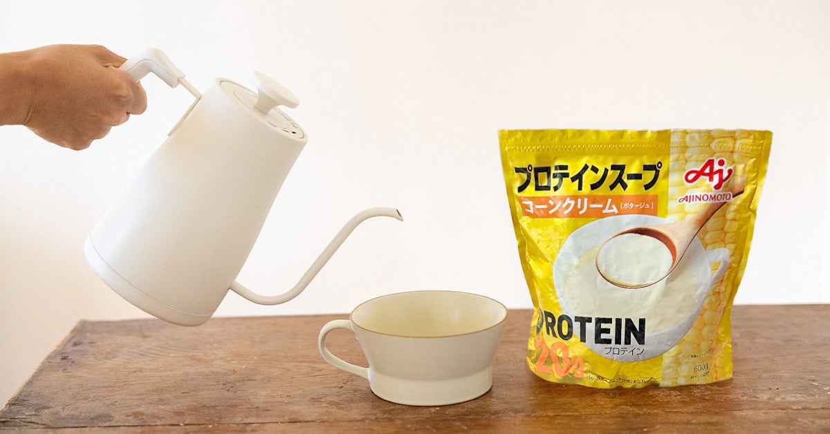 特におすすめなのがこちらの「プロテインスープ」。甘いプロテインが多い中で食事の一品としておいしくたんぱく質が摂れ、寒い冬に便利に使えます。あの「クノール」で有名な味の素が開発しており、味は申し分ありません。試飲もできますが、ぜひ「ホットプロテインCAFE」でお楽しみいただけますと嬉しいです。