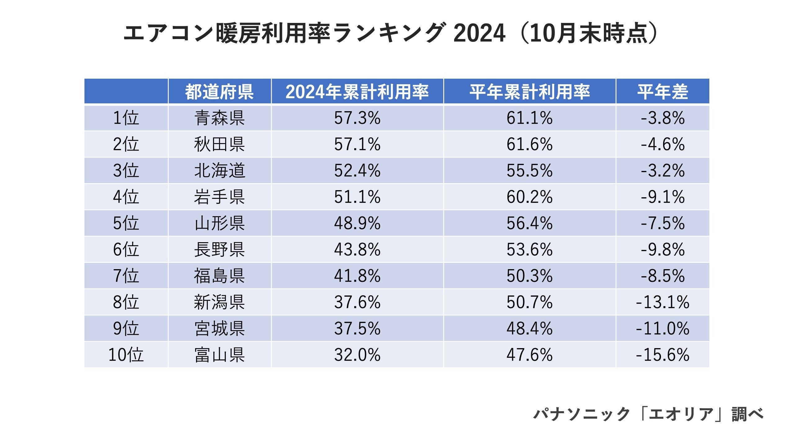 10月末時点で最も暖房利用率が高いのは、1位 青森県、2位 秋田県、3位 北海道、4位 岩手県、5位 山形県と続き、上位4地域では暖房利用率が50%を超えています。