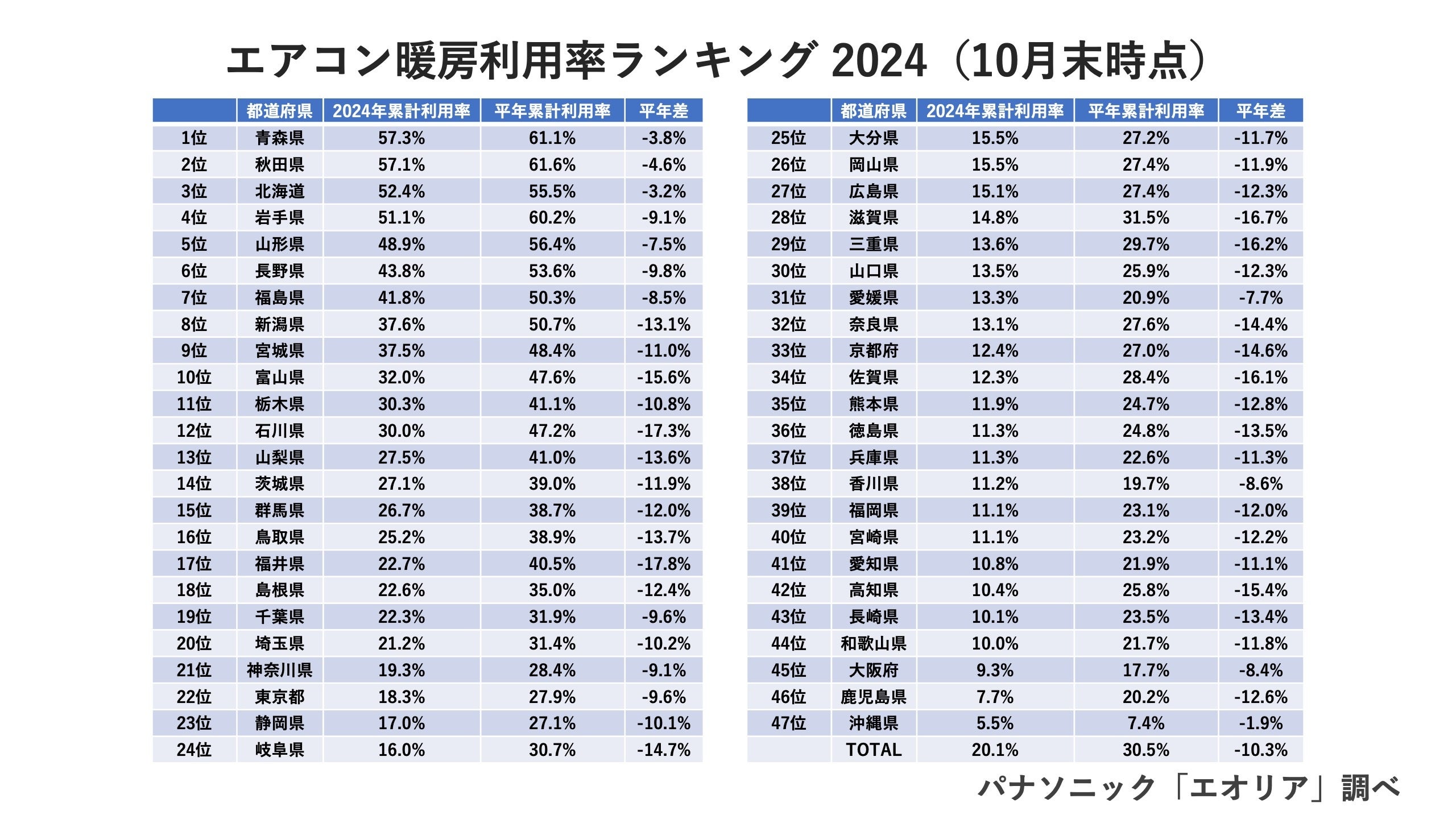 パナソニックは、エオリア アプリに接続したエオリアユーザーの利用データをもとに、今シーズンの「エアコン暖房利用率ランキング」を作成。今シーズン既に一度でも利用したユーザーの割合を表すエアコン暖房累計利用率を算出し、全国47都道府県で比較しました。