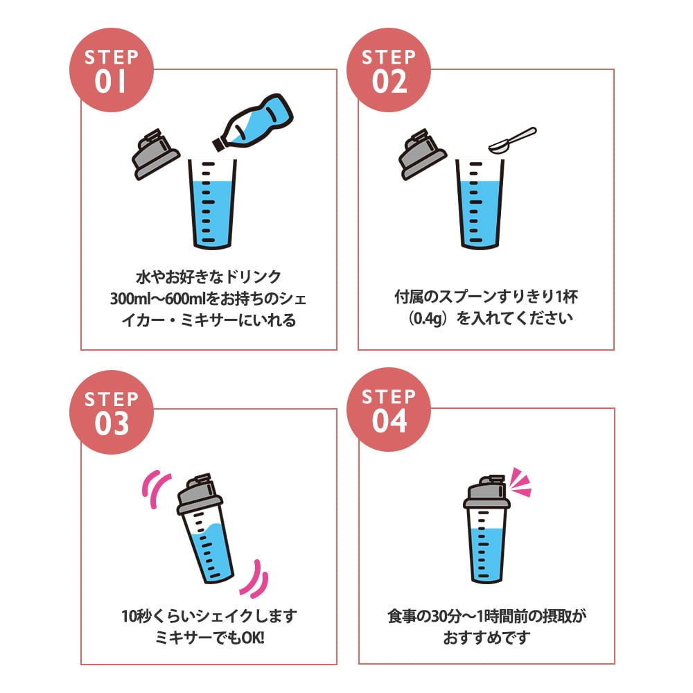 水やお好きなドリンク300〜600mlとスプーンすりきり1杯(1杯0.4g)をシェイカー・ミキサーに入れ、10秒くらいシェイクしてお召し上がりください。
