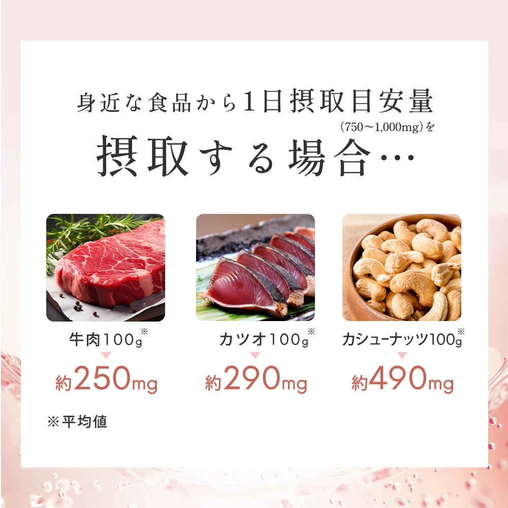 身近な食品からシスチンの1日の摂取目安量(750〜1000mg)を摂取するのは大変ですが、THEシスチンパウダーなら、コップ一杯でシスチン400mgを摂取していただくことが可能に。