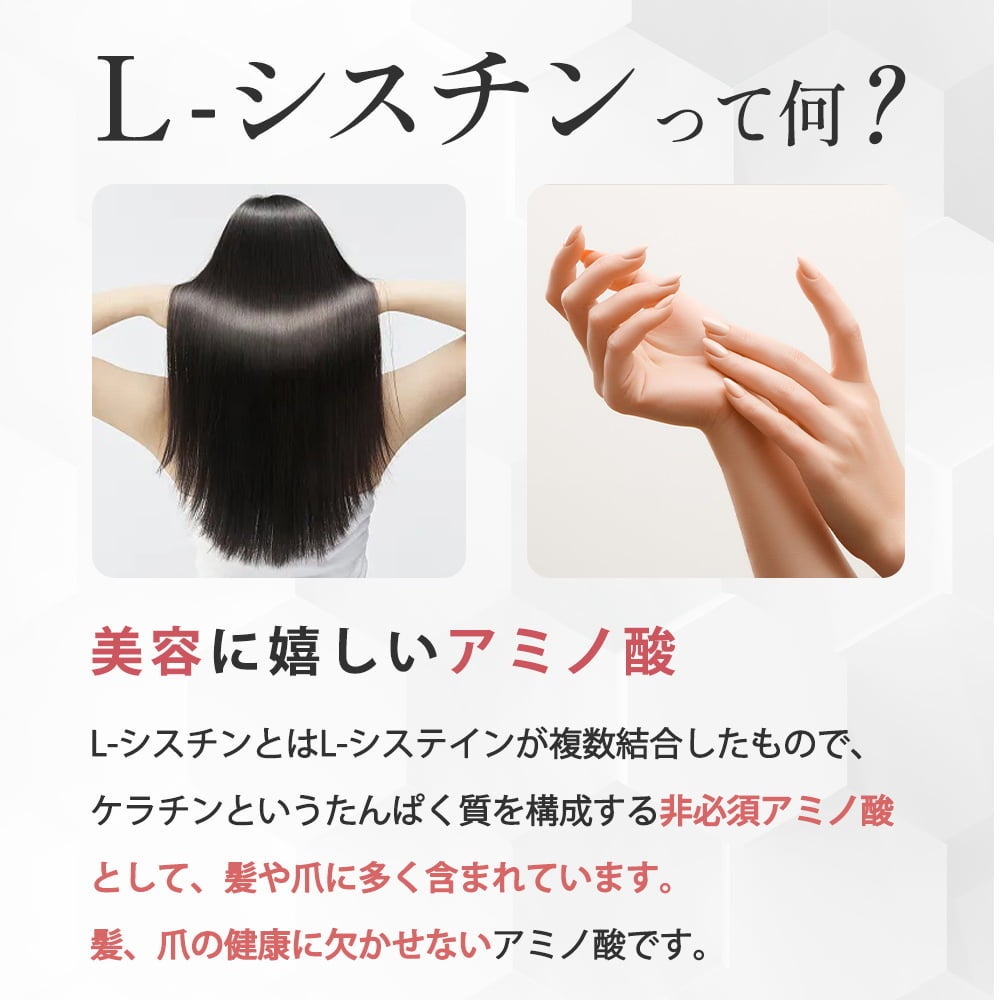 L-システインが複数結合したもので、ケラチンというタンパク質を構成する非必須アミノ酸として髪や爪に多く含まれています。髪、爪の健康に欠かせないアミノ酸です。