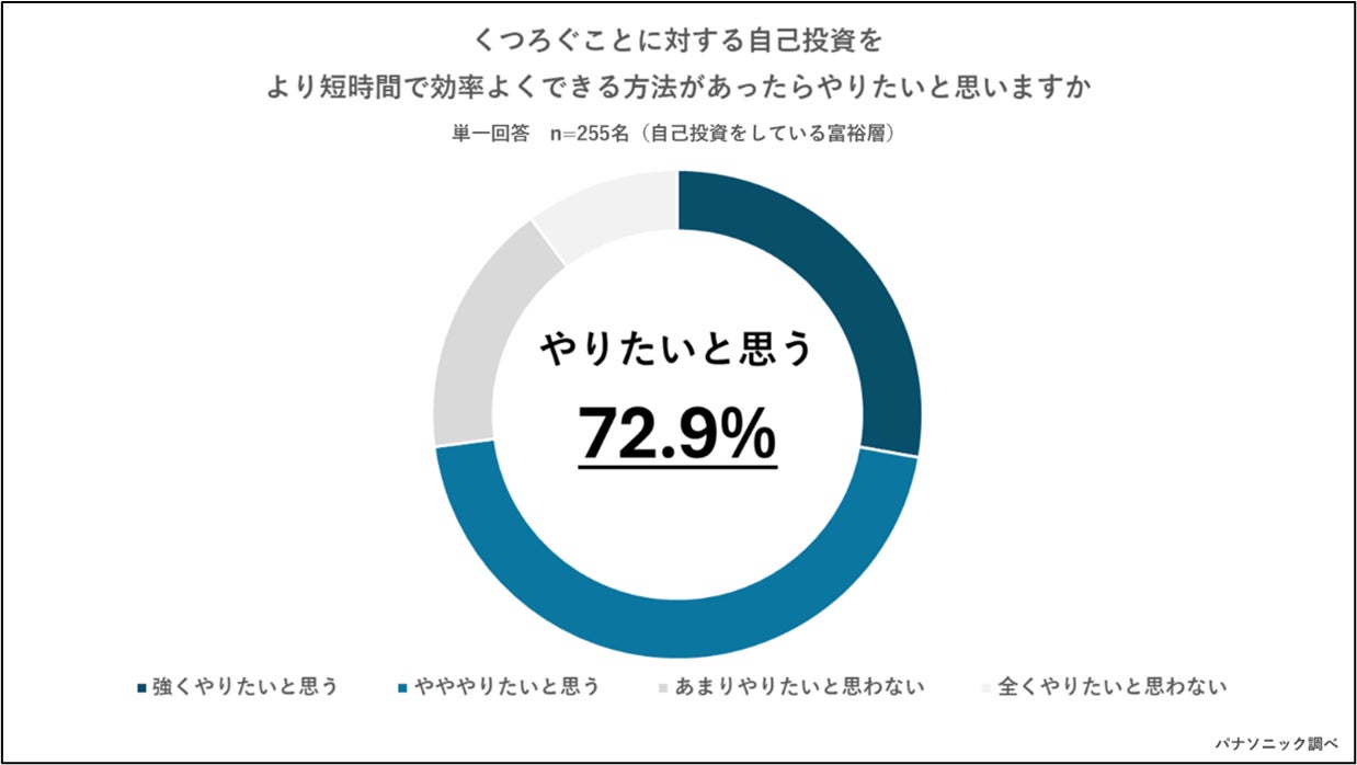 「マッサージをはじめとするリフレッシュなどくつろぐことに対する自己投資が、より短時間で効率よくできる方法があったらやりたいと思いますか」と質問したところ、自己投資を行っている富裕層に限ると72.9%と7割以上が強くやりたい、やややりたいと回答。時間がない課題感がある富裕層にとって、短時間で効率よくできる、くつろぐことに対する自己投資は需要が高いことが明らかになりました。