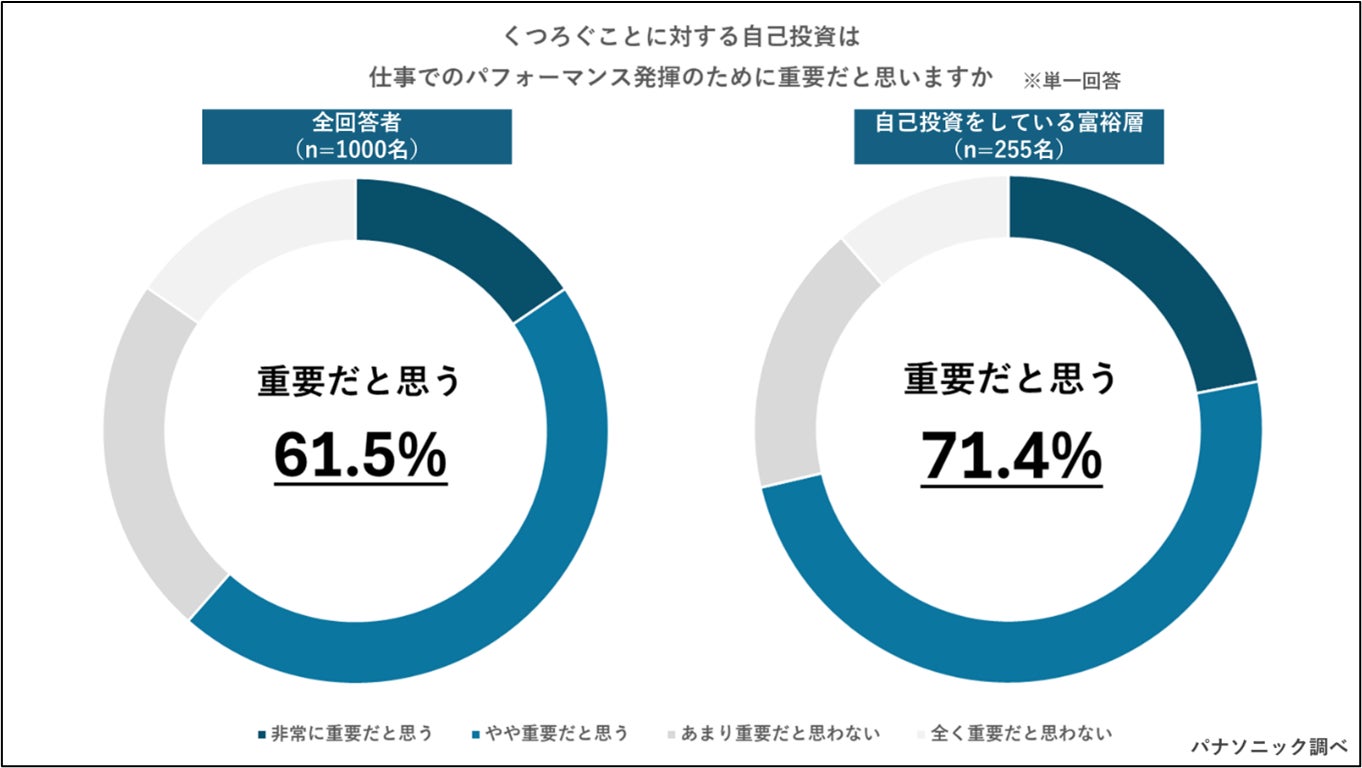 体のケアの一環としてマッサージなどのリフレッシュ方法に着目して調査を実施。健康への自己投資の中でも、「マッサージをはじめとするリフレッシュなどくつろぐことに対する自己投資は、仕事でのパフォーマンス発揮のために重要だと思いますか」という質問に対して、全回答者のうち61.5%が非常に重要だと思う、やや重要だと思うと回答。自己投資を行っている富裕層に限定しても、71.4%が重要だと思うと回答しました。