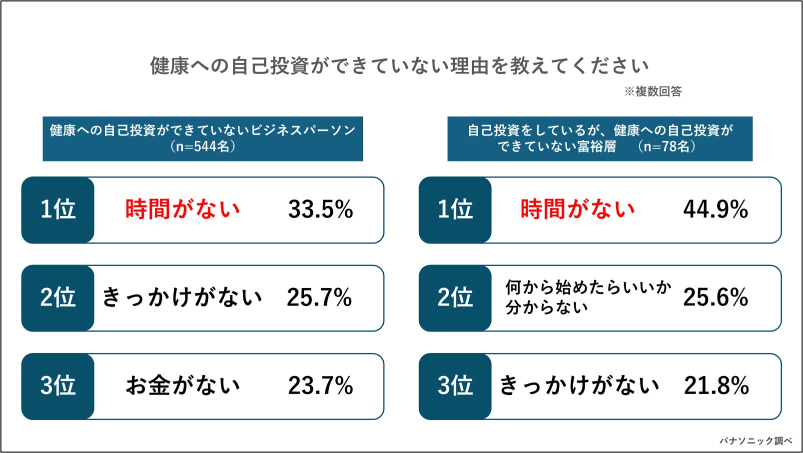 その理由として、健康への自己投資ができていないと回答したビジネスパーソンでは「時間がない」という理由が最も多く33.5%となりました。自己投資をしているが、健康への自己投資ができていない富裕層に限ると44.9%と、次点の「何から始めたらいいか分からない」と約20ポイント差があり、「時間のなさ」が健康への自己投資に取り組めていない大きな要因であることが明らかになりました。