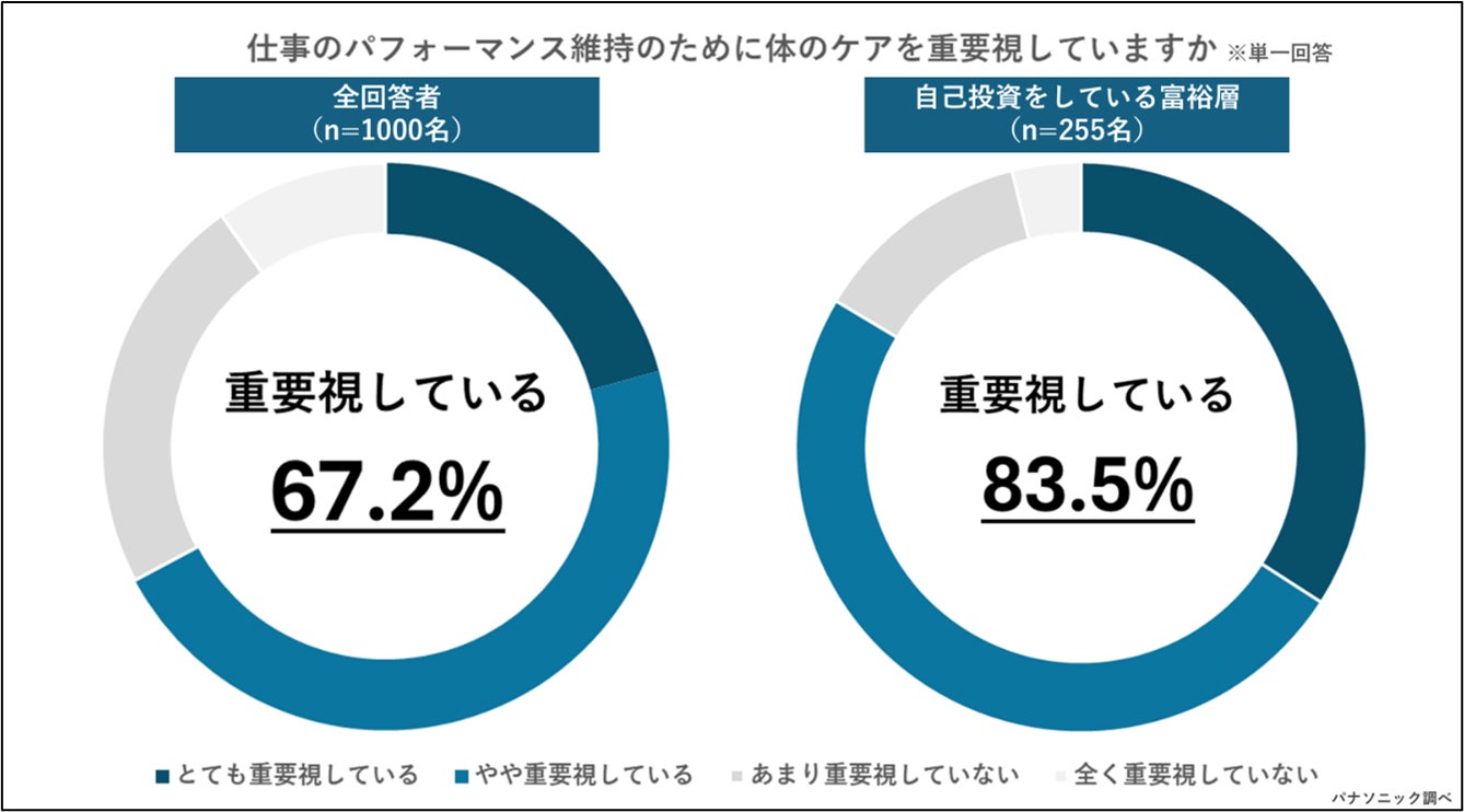 体のケアと仕事のパフォーマンス維持との関係性を聞いたところ、ビジネスパーソン全体では「仕事のパフォーマンス維持のために体のケアを重要視している」と回答した人が67.2%とおよそ3人に2人がパフォーマンス維持のために体のケアが重要と回答。何らかの自己投資を行っている富裕層に限ると83.5%と全回答者と比較して16.3ポイントもの差があることが明らかになりました。