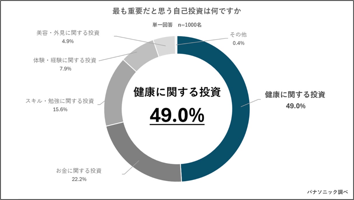 ビジネスパーソンに最も重要だと思う自己投資の内容を質問したところ、最も多かった回答は「健康に関する投資」で49.0%と約半数の人が健康への自己投資を最重要視していることが明らかになりました。自己投資の内容として、スキルアップのための勉強やお金のイメージが強いですが、健康を重視する傾向が強いことが分かりました。