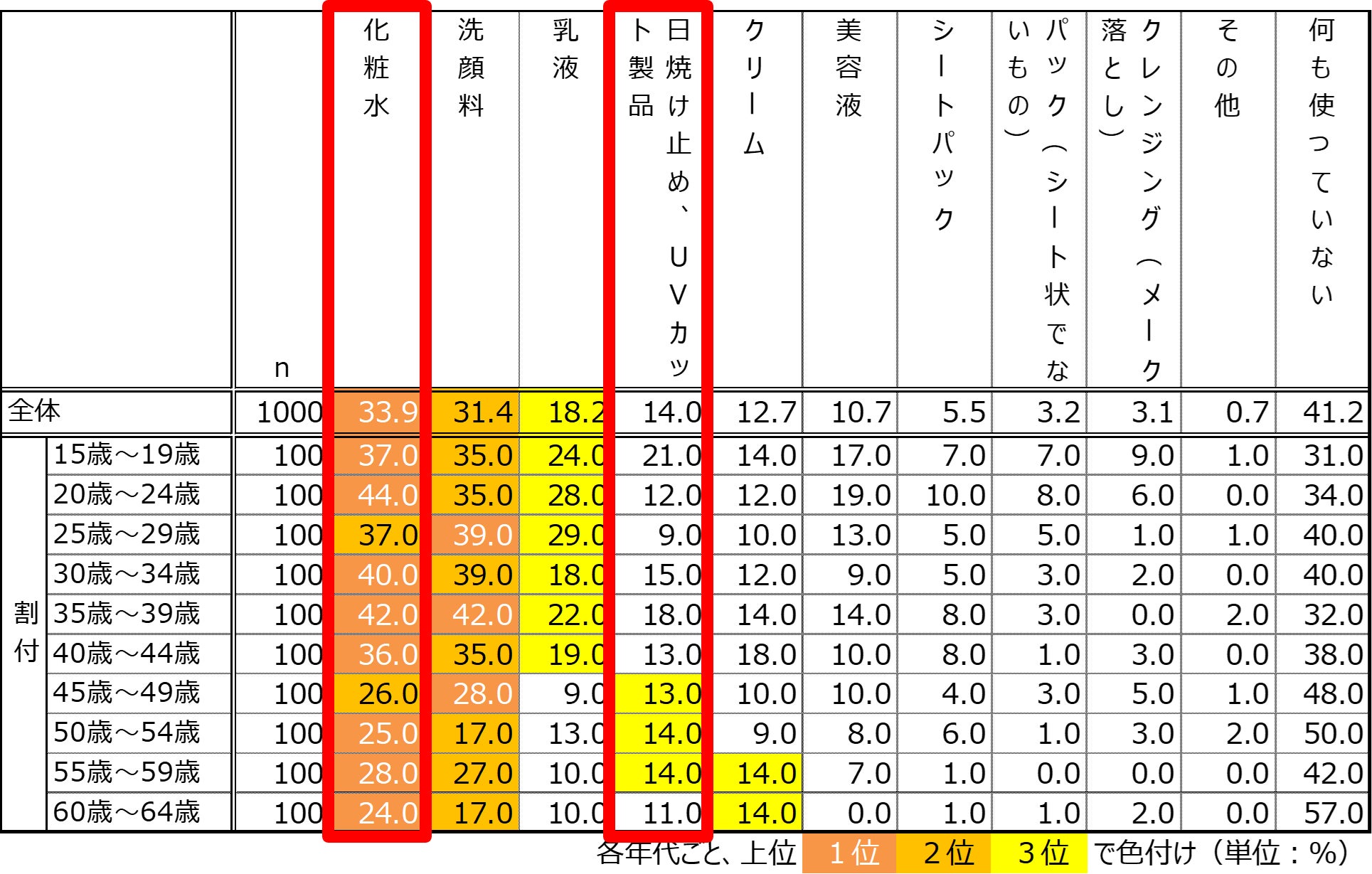 化粧水は男性の3人に1人以上が使用しているのに対し、日焼け止めは使用者はその半分以下