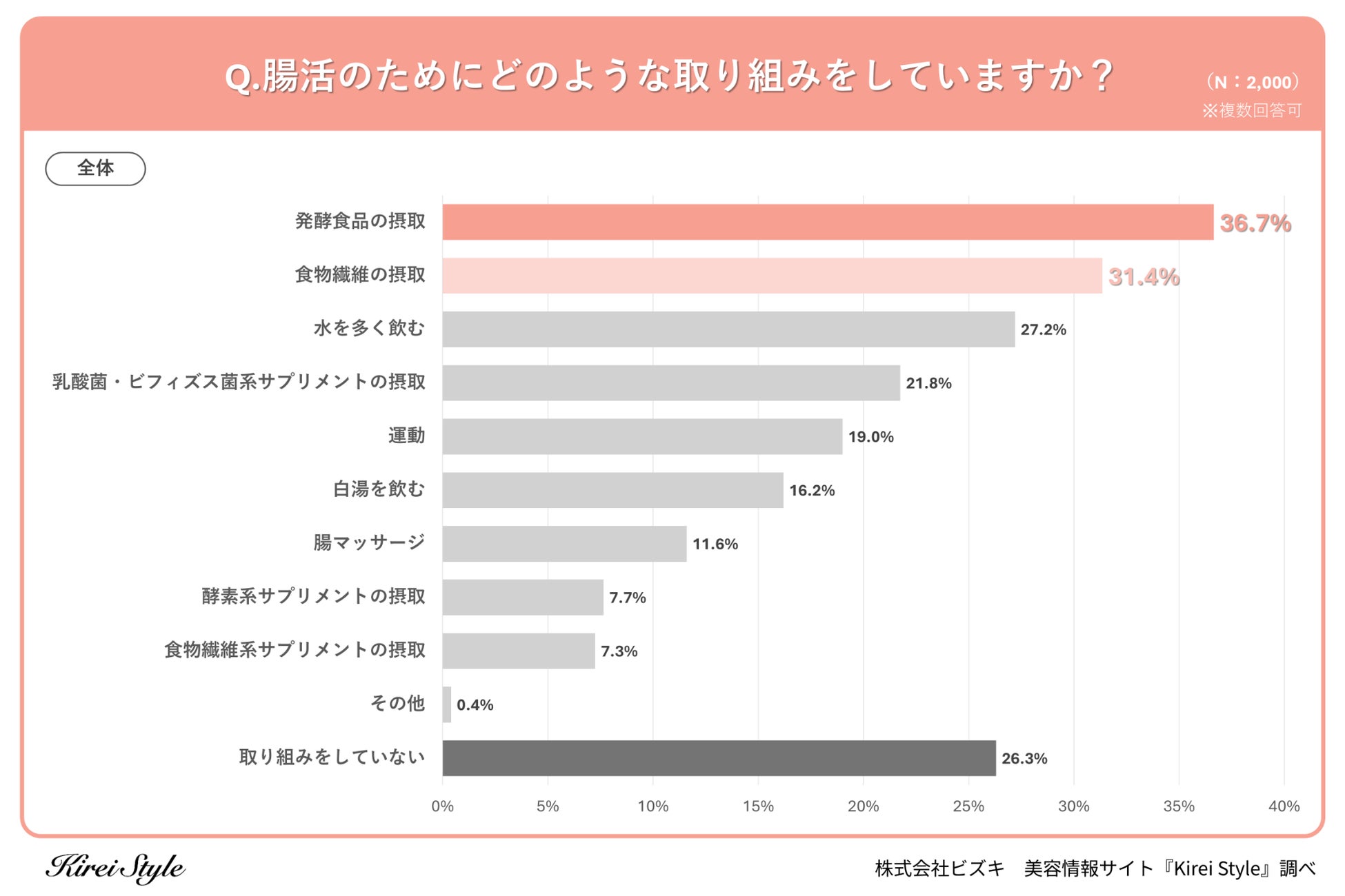 「今のキレイも、10年後の輝きも」をコンセプトに美容や健康にまつわる情報を発信する「Kirei Style(キレイスタイル)」の運用を行う株式会社ビズキは、全国の女性2,000人を対象に腸活に関するアンケートを実施し、年代別等の特徴についてまとめました。