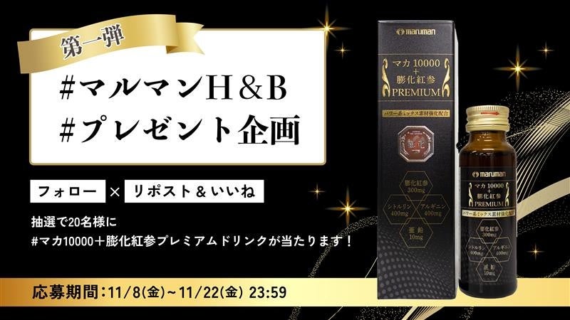 マルマンH&B株式会社(本社:東京都千代田区、代表取締役社長:溝田 勝彦)は、2024年11月8日(金)~11月22日(金)、マルマンH&B健康食品のX公式アカウントにて「マカ10000+膨化紅参プレミアムドリンク」プレゼントキャンペーン(以下、本キャンペーン)を実施いたします。