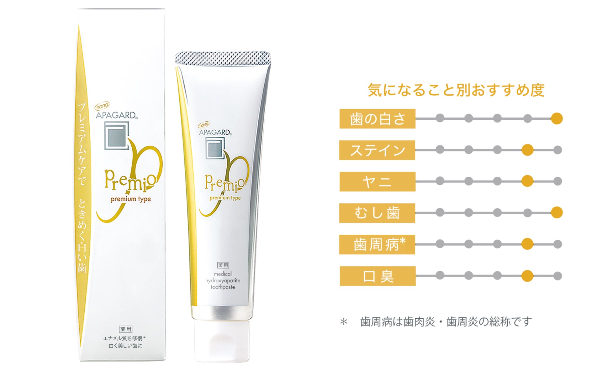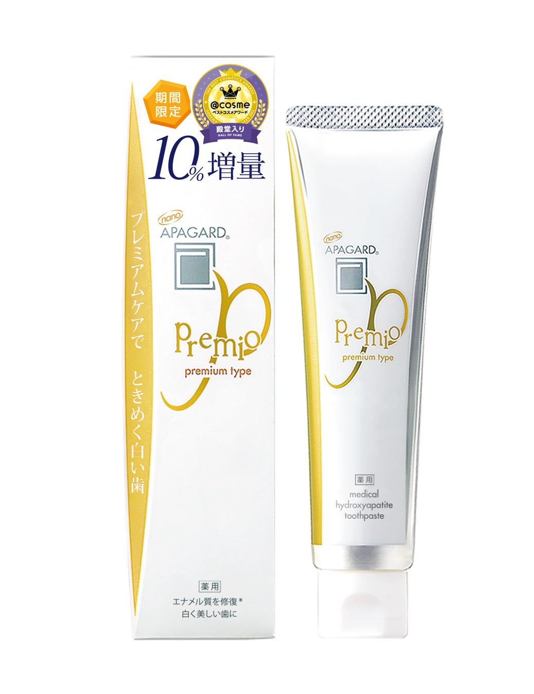 今回増量する「アパガードプレミオ」は、シリーズ1番人気のプレミアムタイプ。サンギ開発の薬用成分「薬用ハイドロキシアパタイト」を高配合*2しています。この成分は、歯垢を吸着除去し、ミネラルが溶け出したエナメル質の欠損部にナノレベルで歯の主成分*3ハイドロキシアパタイトを補給して修復・再石灰化するという3つの作用でエナメル質を整え、むし歯を予防します。