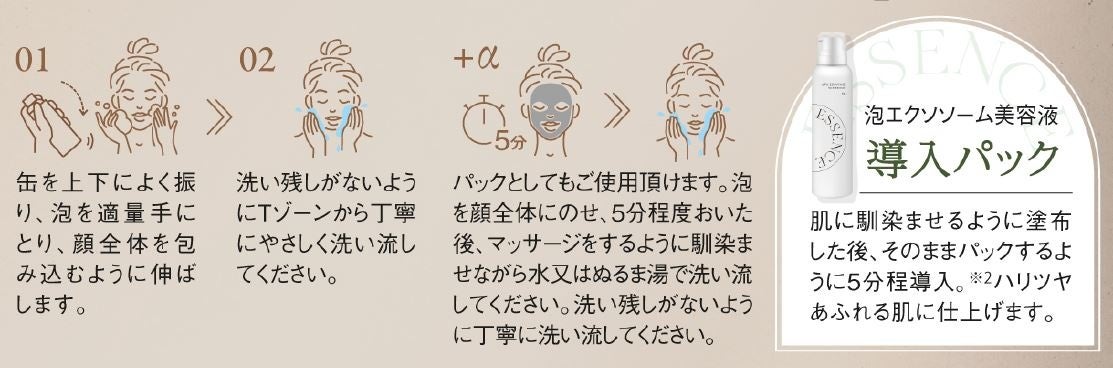 商品説明:炭(※1)×マイクロバブル×エクソソーム(※2)を配合したプレミアムウォッシュ。濃密な炭(※1)の泡で皮脂や汚れを吸着して洗い上げながらも、ヒトサイタイ血幹細胞順化培養液やツボクサエキスなどふんだんに配合した美容成分により、洗うたびすっきりハリツヤ肌へ導きます。