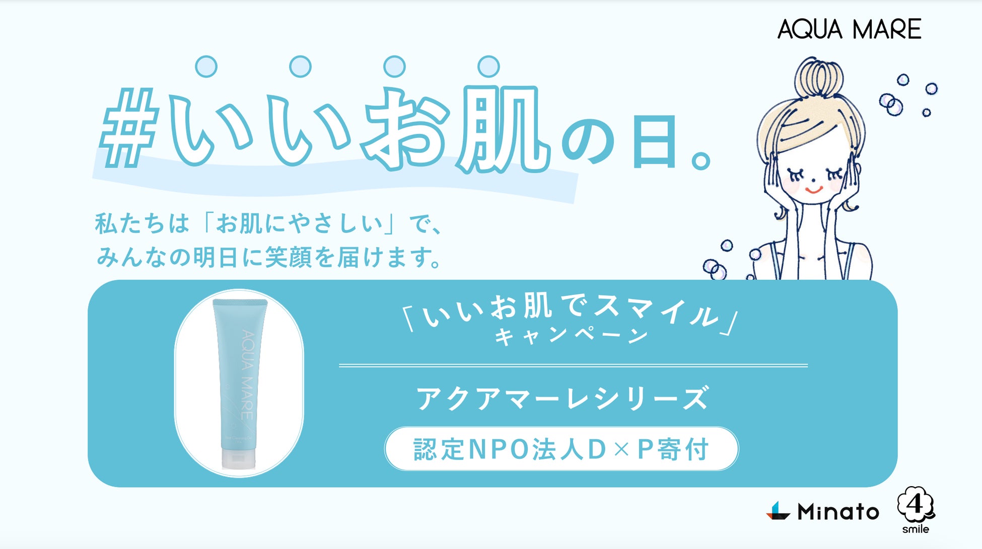 マーケティング支援を専門とする株式会社Minato(本社:東京都港区、代表取締役CEO:山﨑雄太/以下当社)と化粧品企画販売を行う子会社の株式会社4-smile(本社:東京都港区、代表取締役:長谷川 慎 以下、4-smile)は共に、2024年11月8日「いいお肌の日」に合わせて、ユース世代の孤立支援を行う認定NPO法人D×Pに〈AQUA MARE(アクアマーレ)〉シリーズの基礎化粧品を合計540本寄付いたします。今回の寄付を通じて、ユース世代のみんなが笑顔で『明日』が楽しみになる、肌のセルフケアの推進を目的としています。