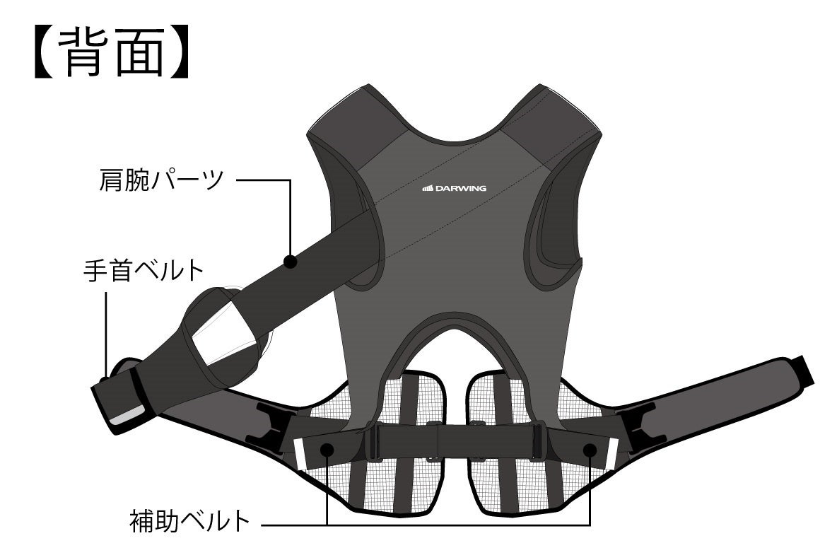 「DARWINGワーキングアシストAS」は人力掘削作業の負担軽減を図るために開発されました。腰コルセット+腕サポートパーツが付随した、身体に密着したベスト型のアシストスーツです。掘削作業時に腕を引き上げ、腰を安定させることにより作業時の負荷を軽減します。