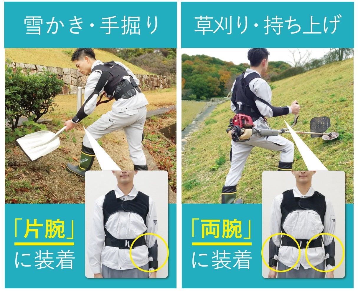 雪かきや穴掘りなど一方向にすくい上げてひねるような動作では肩腕ベルトを片腕のみ装着し、草刈機の操作や荷物を持ち上げるような動作では両腕に装着することで機能を発揮します。