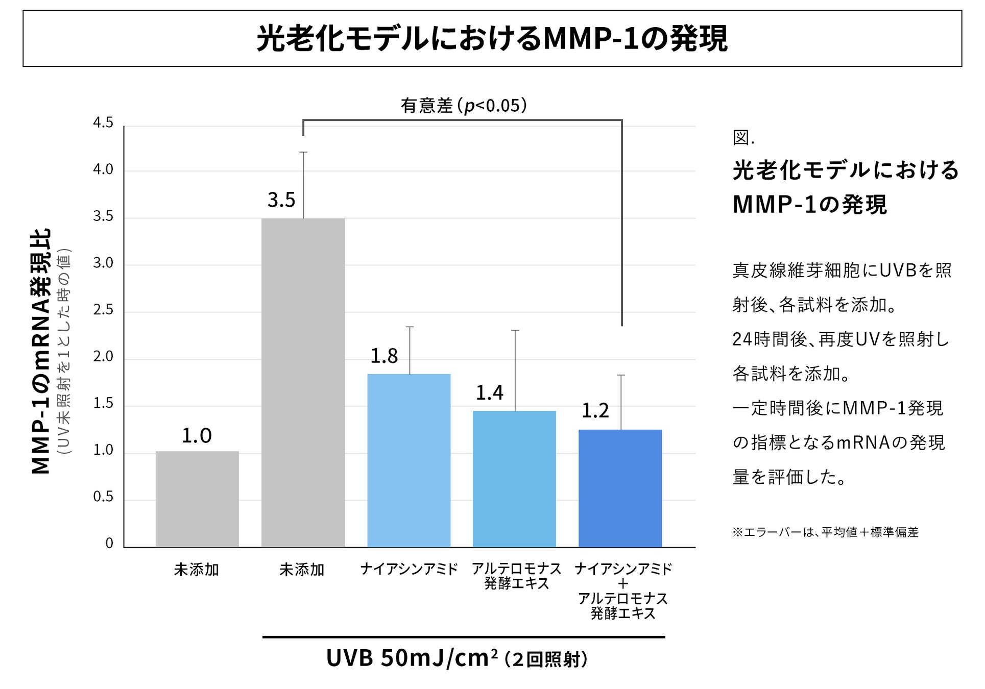 さらに注目すべきポイントとして、ナイアシンアミドとアルテロモナス発酵エキスを併用した群においては、ナイアシンアミドのみを添加した群よりも高いMMP-1の発現抑制効果が認められました。この結果は、この両成分の組み合わせが、ナイアシンアミド単独使用よりも光老化に対して効果的にアプローチできることを示唆しています。