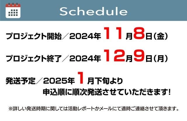 ※詳しい発送時期はに関しては活動レポートかメールにて適時ご連絡させて頂きます。