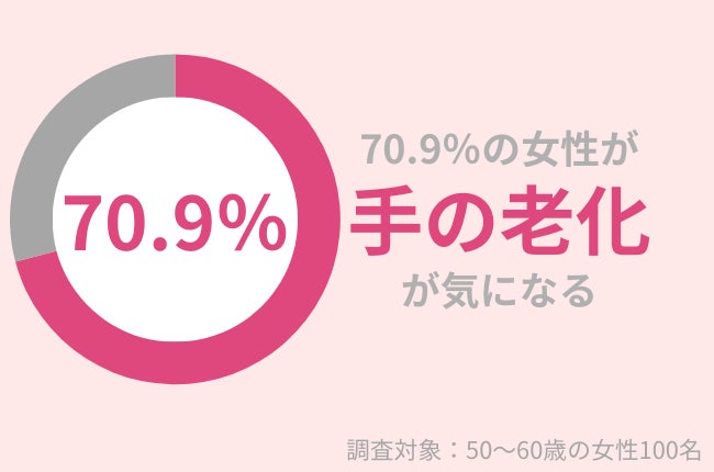 調査の結果、50代女性のうち、70.9%の方が「手の老化」が気になっていることがわかりました。乾燥やシワ、シミ、血管の目立ちなど、様々な症状により、手が老けて見えることがあります。手は他人からも自分からもよく見える部位なので、若々しく健康的でいたいという願望を持つ方が多いです。