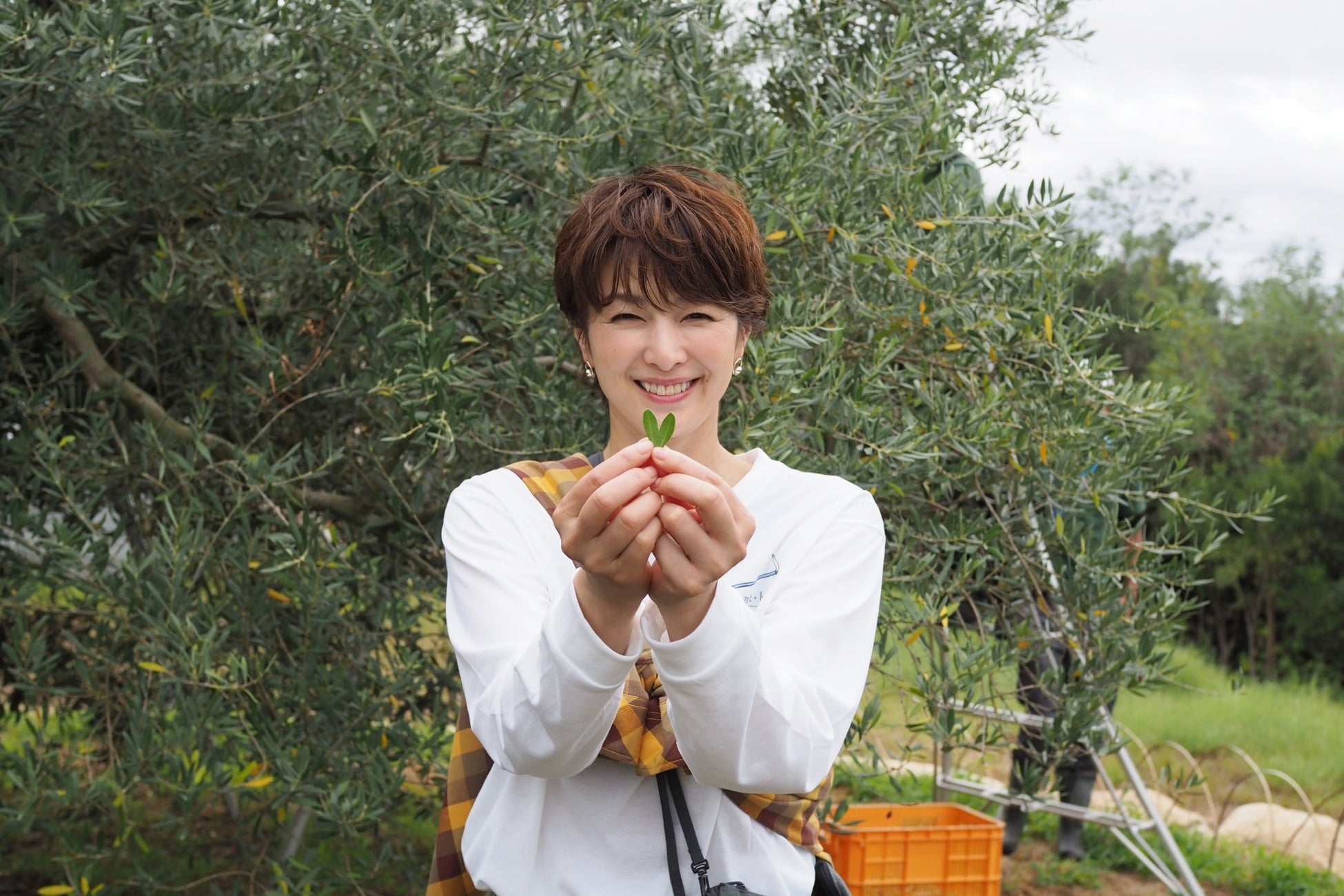 「樹齢千年のオリーヴ大樹」に結実するオリーブの果実は、ひとつひとつ丁寧に収穫します。今回は小豆島に来られていた女優の吉瀬美智子さんにも収穫のお手伝いをしていただきました。
