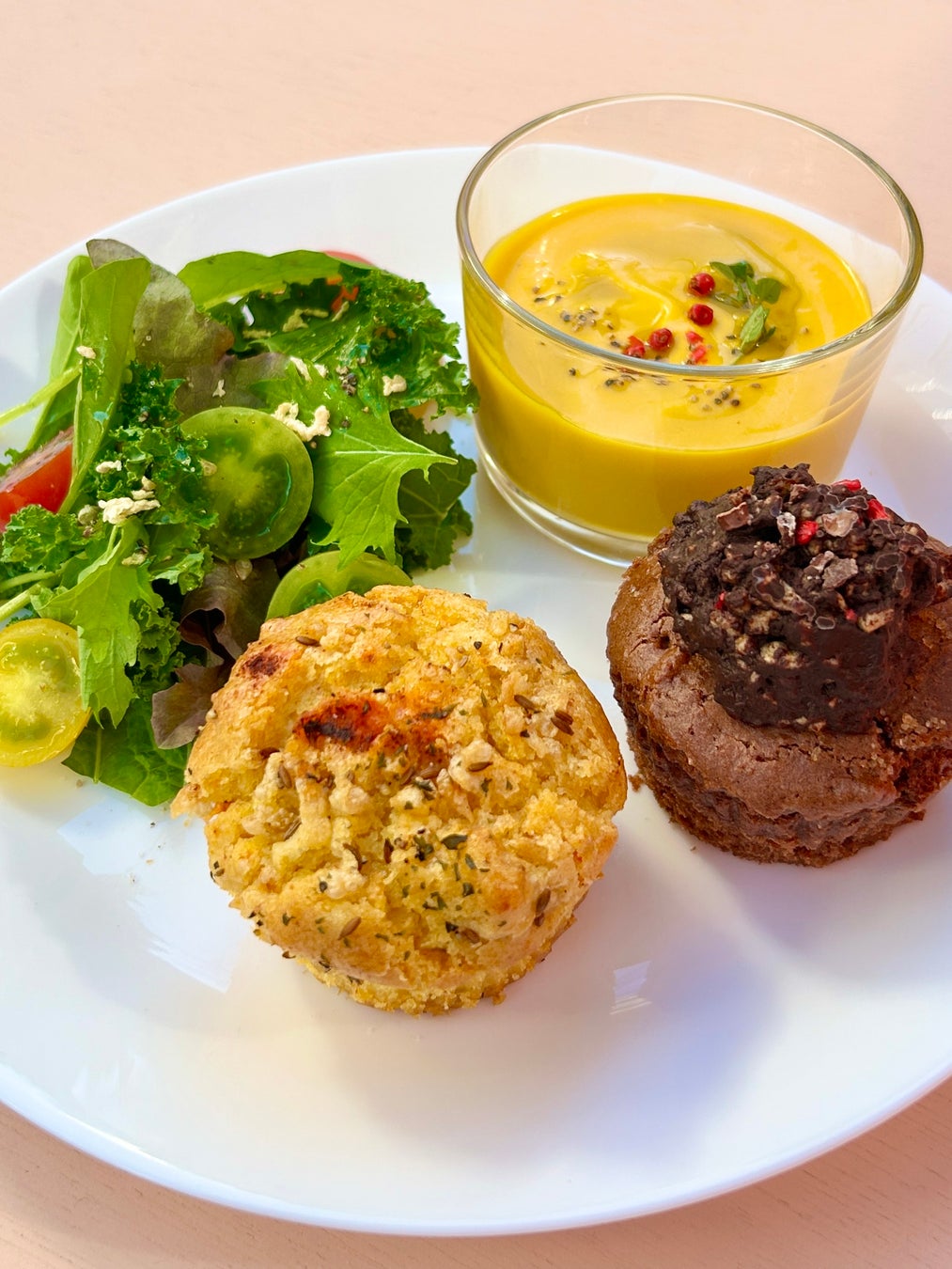 ランチメニューでは、パートナーブランド「milco sweets(ミルコ・スウィーツ)」とコラボレーションし、グルテンフリーのマフィンやスウィーツをお楽しみいただきます。おいしくてボリューミーながら、食物繊維が豊富でヘルシーなランチをご提供。そら豆プロテインパフが練り込まれた絶品のお惣菜マフィンとデザートマフィンのダブルのマフィンに、サラダ、ポタージュで良質なタンパク質モリモリのメニューをお召し上がりいただきます。