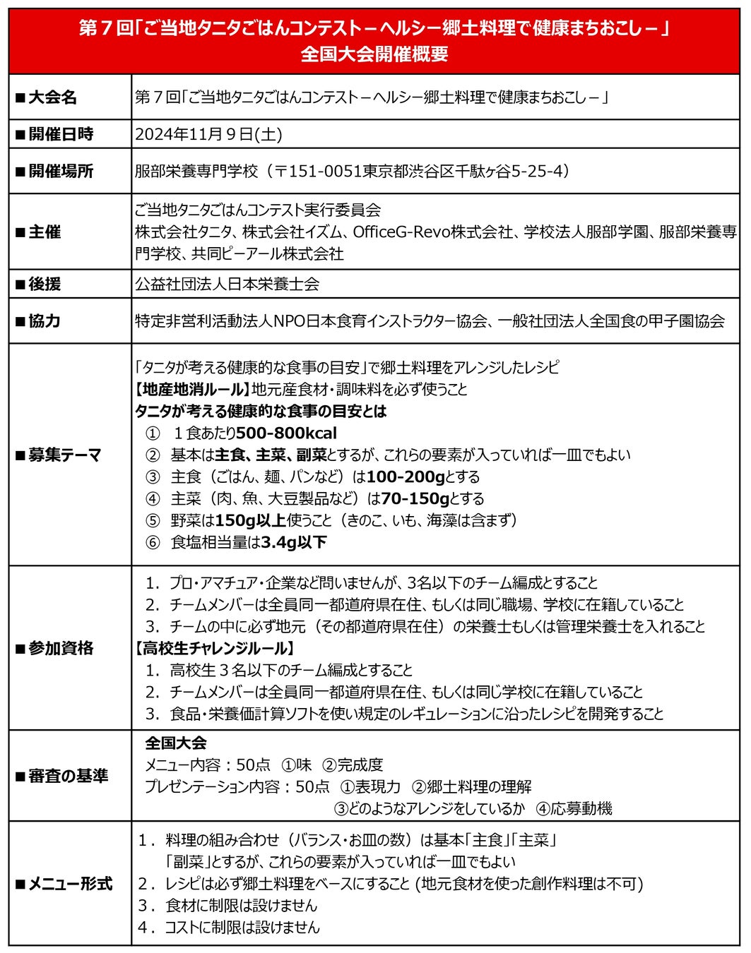株式会社タニタ(本社:東京都板橋区、代表取締役社長:谷田千里)などが主催する「第7回ご当地タニタごはんコンテスト―郷土料理でまちおこし―」の全国大会が11月9日(土)、服部栄養専門学校(東京都渋谷区)で開催され、グランプリに東北ブロック代表 秋田県横手市の「Comer(コメール)+」が輝きました。また、準グランプリは近畿ブロック代表 滋賀県米原市の杉江治子さんチームと、中国・四国ブロック代表 山口県下関市の松岡沙耶香さんチーム、一般審査員が選ぶ特別賞には九州・沖縄ブロック代表の鹿児島県いちき串木野市の「Infini Girls」にそれぞれ決定しました。本リリースでは、グランプリ・準グランプリ・特別賞を獲得したチームを紹介いたします。