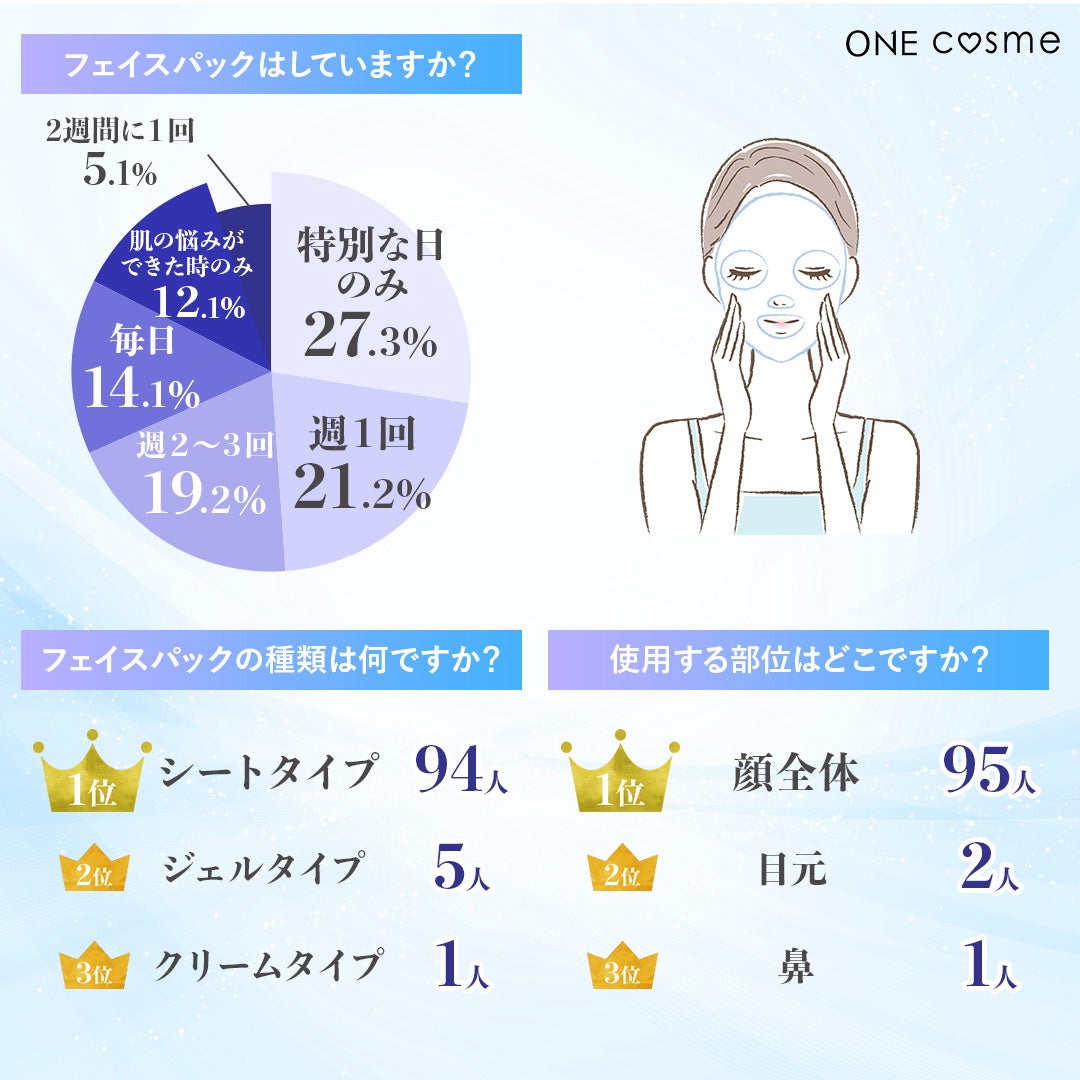 今回の調査では、回答者の約半数が「週に1回以上」フェイスパックを使用していると回答し、14%の人は「毎日」フェイスパックを使用していると判明しました。