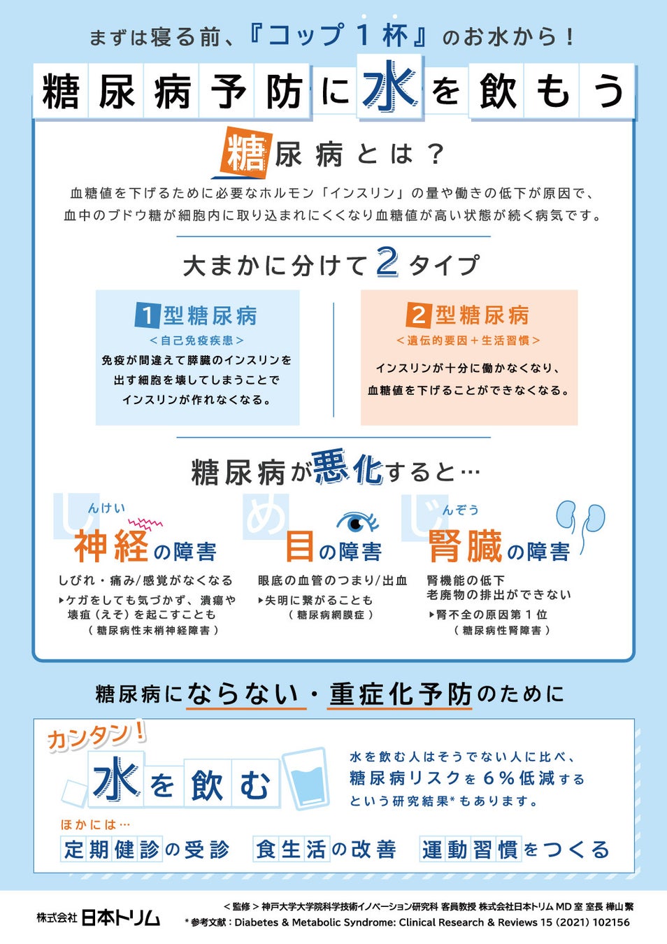 グローバルメディカルカンパニーを目指す株式会社日本トリム(本社:大阪市、代表取締役社長:田原周夫、以下「日本トリム」)は11月14日(木)の「World Diabetes Day(WDD)」に合わせ、糖尿病の啓発を目的に「糖尿病予防ポスター」を制作し、2024年11月11日(月)から電解水素水と暮らしのウェブサイト「トリム・タウン」で無料配布します。どなたでもダウンロードしてお使いいただけます。
