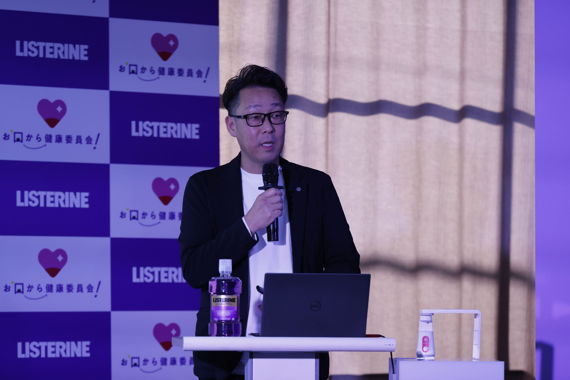 「お口の二大疾患、虫歯と歯周病はどちらも口内菌によるものです。お食事を楽しめなくなるだけでなく、糖尿病や、早産、低体重出産など、全身疾患との関わりも歯周病ガイドラインで示されています。お口の中の菌は、歯の表面に強く付いているだけでなく、口内で悪玉菌として育ってしまいます。歯ブラシだけでは歯の表面の6割しか汚れが取れません。残りはフロス、歯間ブラシで除去するのが大切です。更に、浮遊する菌や、粘膜に付いている菌に対しては、マウスウォッシュで化学的に殺菌することが推奨されています。また、セルフケアだけだと自己流になってしまったり、難しかったりすることが多いので、予防としてプロフェッショナルからのアドバイスを受け、みなさんのお口に合ったケアをアップデートしていただければと思っております。」と、セルフケアだけでなく自分自身に合ったケアを歯科医と一緒に模索し、予防することが大切とお話されました。