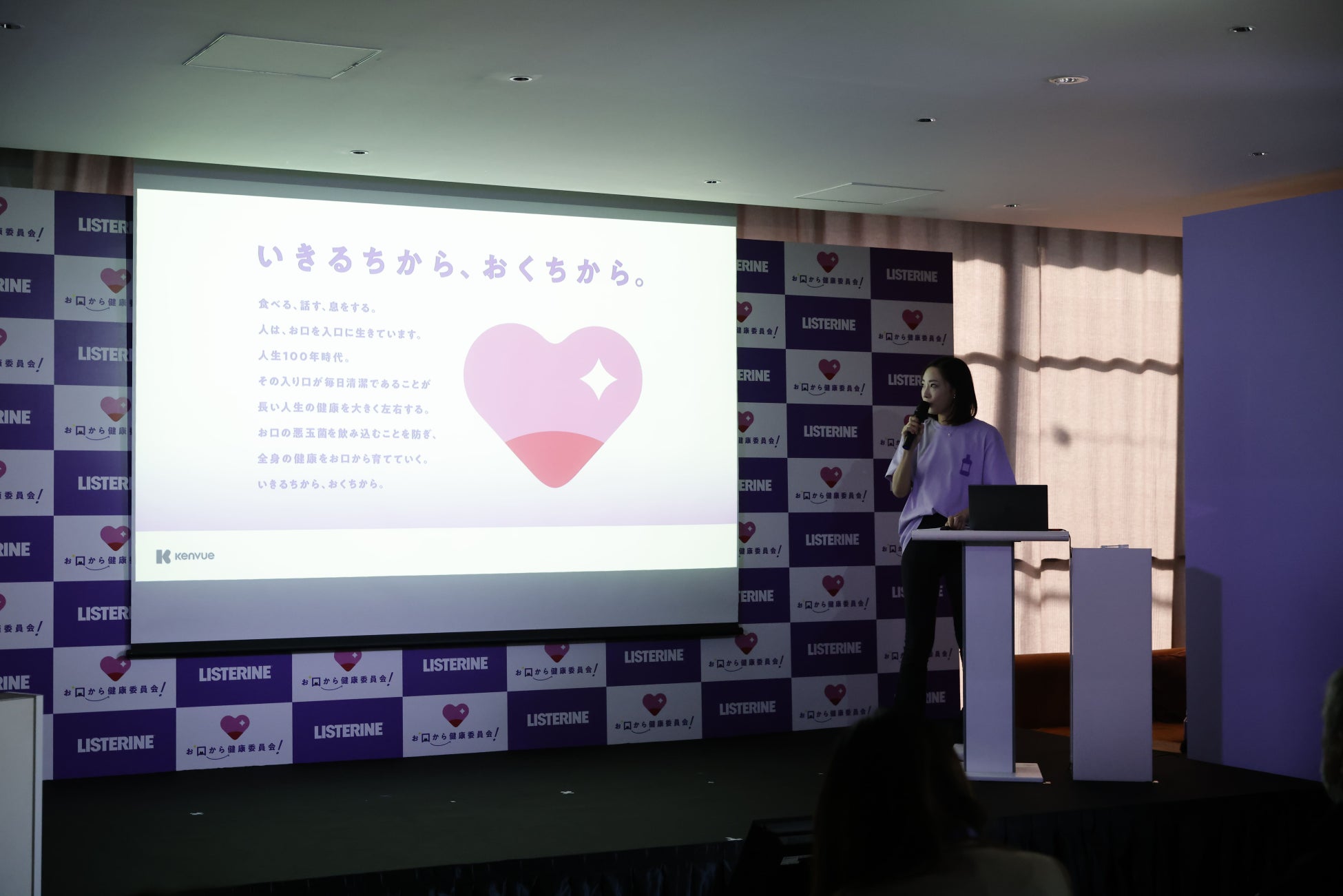 発表会では、Kenvueシニアディレクター 浦崎里奈から、発表会の概要と目的について、東京科学大学 安達奈穂子先生からは、お口の健康と全身の健康の関係についての講演がありました。