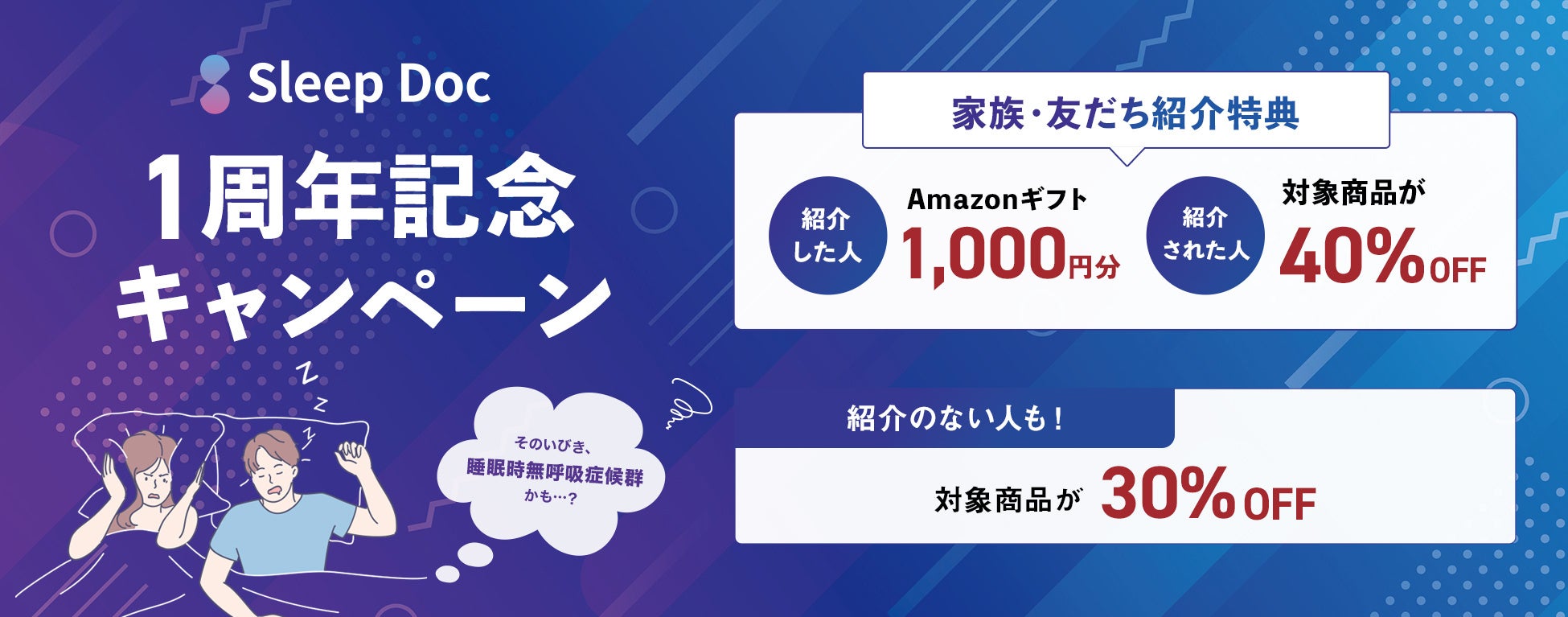 そこで、今回はSleep Doc1周年を記念して、対象サービスが定価より30%OFFになるキャンペーンを実施するほか、睡眠時無呼吸症候群に気づくためには、周囲の人々からの指摘が重要であることを踏まえ、家族・友だち等による紹介の場合には、最大40%割引でのサービス提供を行い、紹介者にはAmazonギフトカード1,000円進呈を実施します。