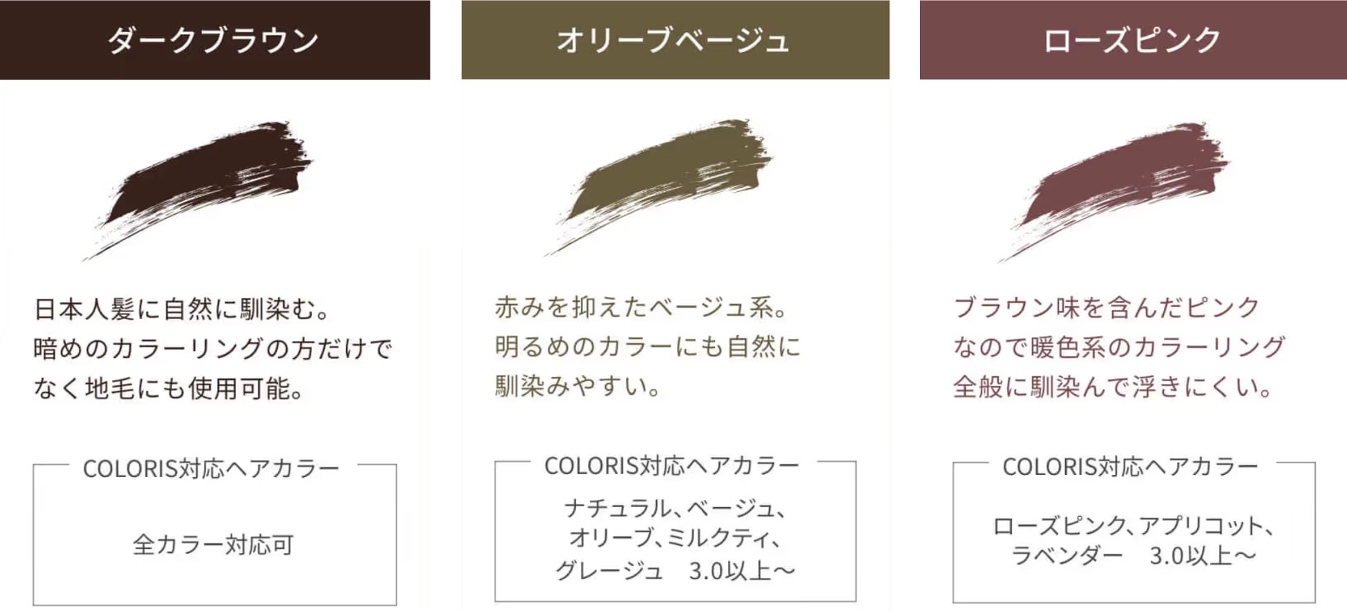 ダークブラウン・オリーブベージュ・ローズピンクの3色展開で、白髪を美しく彩ります。
