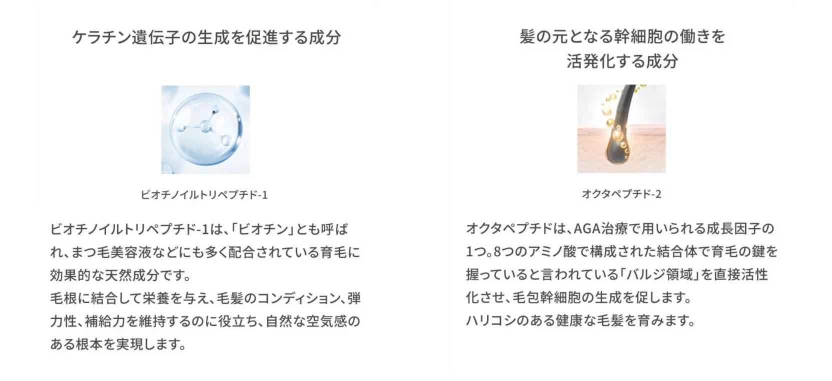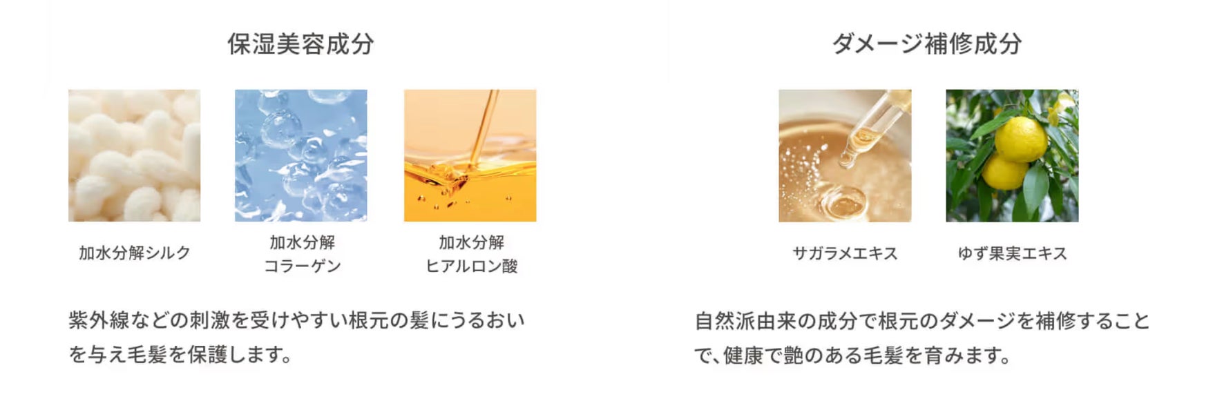 また、白髪を一時的に隠すだけでなく、艶やかな髪を育む保湿美容成分をたっぷり配合。さらに、髪を作る元となる幹細胞の働きを活発する「ビオチノイルトリペプチド-1 」「オクタペプチド-2 」を配合し、使い続けることで根元のふんわり感を実現します。