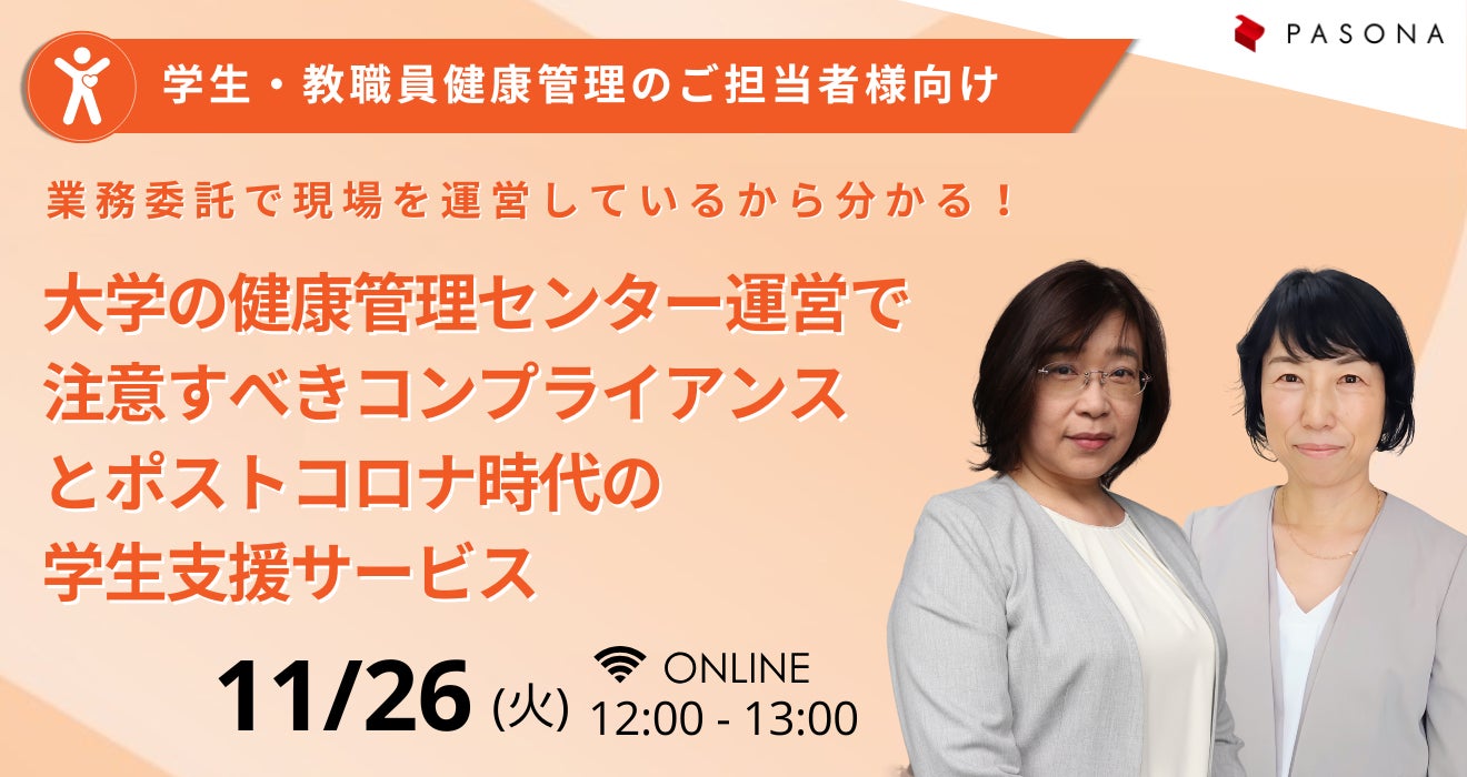 株式会社パソナは学生・教職員の健康管理ご担当者様を対象にしたウェビナー『大学の健康管理センター運営で注意すべきコンプライアンスとポストコロナ時代の学生支援サービス』を、11月26日(火)にオンラインにて開催いたします。
