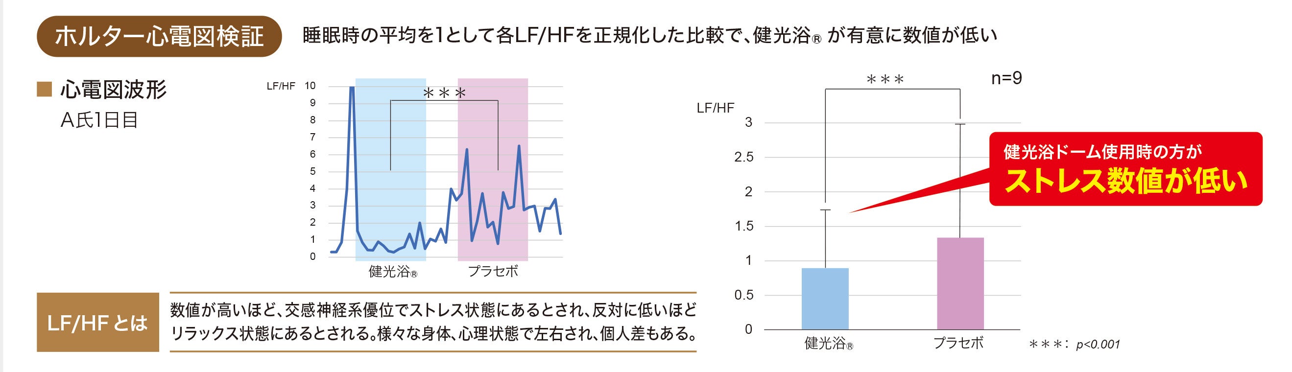 日中の集中力を維持するための方法としてNASAで仮眠(Nap)の研究が行われ、その内容は1995年に公表されました。その後、Power Napという言葉で米国の大企業を中心に導入が進み、日本でも近年取り入れる企業が増えています。その後も研究は進み、昼の時間帯に30分未満の実施でパフォーマンスが向上するともいわれています。今回の検証はその質を高めることを主眼とし、これまでの検証から確認されてきたPhiten社の技術が筋肉を緩めるとの内容を応用するカタチで実施しました。アウトカムには脳波のα・β・θ波成分とホルター心電図で自律神経系の指標であるLF/HFを用い、リラックスした状態では脳波のα・θ波成分が高まり、β波成分が抑えられ、LF/HFは低下することになります。健光浴®とPhiten技術を用いないプラセボを仮眠中に利用して比較し、健光浴®で良好な結果が得られたため、Phiten技術が休息の質を明らかに高めると確認されました。PowerNapでの利用にとどまらず、夜間の睡眠や休息をとりたい様々な場面で、健光浴®は広く、また簡便に活用できると考えられるため、おすすめします。