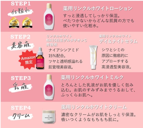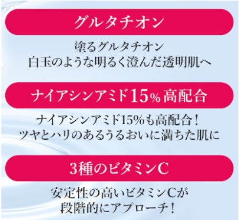 リンクルホワイトは”今からはじめるエイジングケア”として手軽に手に取れ、うるツヤ肌に導いてくれるスキンケアシリーズとして2023年の発売以来大変人気となりました。本商品は、ハリツヤのある肌へ導く大人気美容成分ナイアシンアミドを15%と高配合し、グルタチオンや美容医療発想成分なども贅沢に配合した美容液として同ブランドから新しく発売いたします。3種のビタミンC誘導体や、次世代成分エクソソーム※などの美容成分をたっぷり配合しているので、お手入れにプラスしていただくことで、ツヤと透明感あふれる白玉美肌に導いてくれる、肌管理美容液です。 ※1 プラセンタ