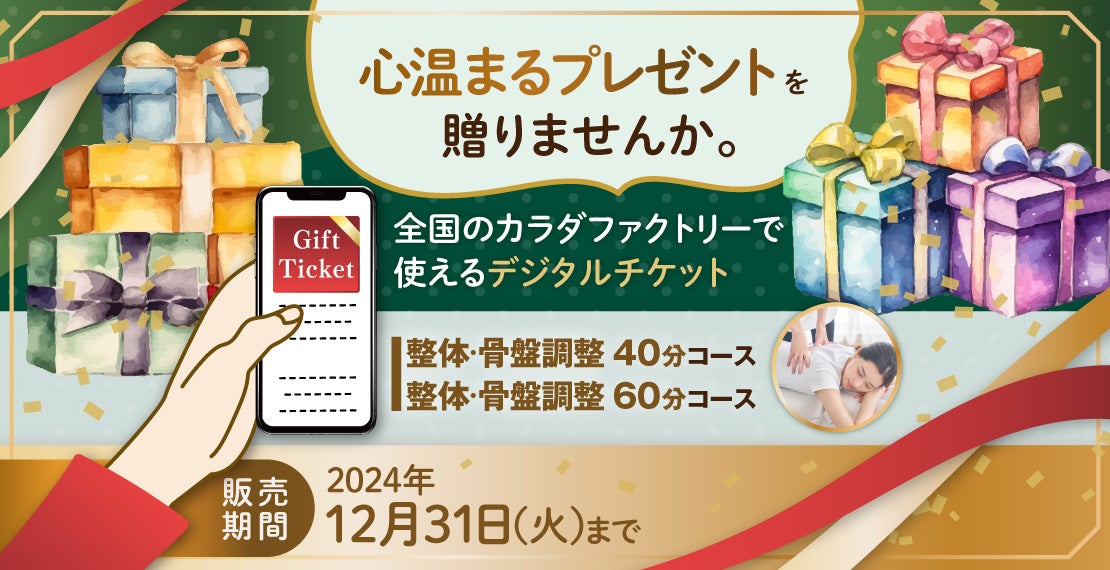 整体×骨盤サロン「カ·ラ·ダ ファクトリー」(以下 カラダファクトリー)を展開する株式会社ファクトリージャパングループ(本社:東京都千代田区、代表取締役社長:髙橋 健介、以下 ファクトリージャパン)は、クリスマス&冬ギフト需要に期間限定(2024年11月13日(水)~12月31日(火))で全国のカラダファクトリーで使える便利なデジタルチケット(eGIFT)を販売いたします。