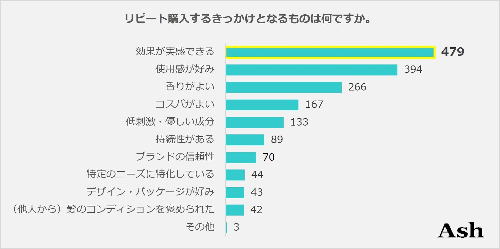最後に、シャンプーをリピート購入するきっかけを調査しました。使用後の「効果が実感できる」が最も高く、第1位となりました。第2位はシャンプー中の「使用感が好み」、第3位は「香りが良い」と続き、使用中の使い心地や香りを楽しむためにリピートするケースもあるようです。第4位は「コスパが良い」となりました。リピートには価格は外せません。価格と価値に見合った商品でなければ、継続することは難しいということです。第5位は「低刺激・優しい成分」がランクインしました。良い成分でも強すぎたり、使い続けることで負担になってしまうケースもあるため、低刺激なものを求める傾向があるということがわかりました。