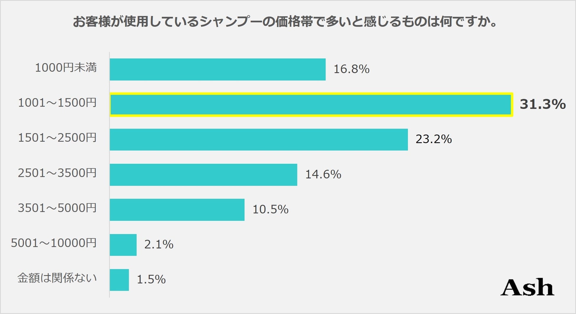 お客様が使用しているシャンプーの価格帯で多いと感じるものは「1001~1500円」が31.3%で第1位となりました。続いて第2位が「1501~2500円」の23.2%、第3位が「1000円未満」の16.8%となりました。