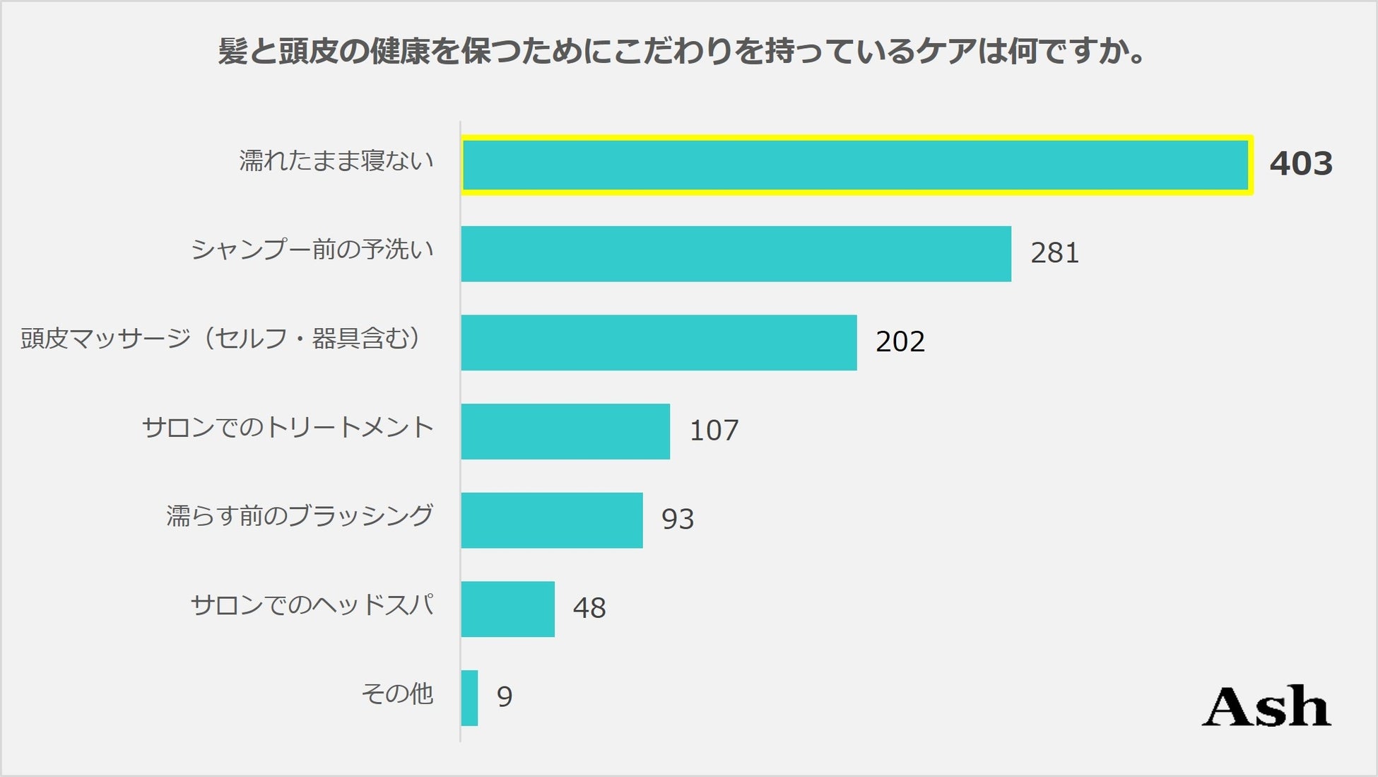 髪と頭皮の健康を保つためにこだわりを持っているケアは「濡れたまま寝ない」と回答した美容師は403名で第1位となりました。前回アンケート調査【ドライヤー編】でも「お客様にドライヤーをする際にこれだけは必ずやってほしいこと」の第1位に「しっかり髪の毛を乾かした状態で就寝」という回答が半数を占めておりました。濡れた髪の毛は高温多湿の状態のため雑菌が繁殖しやすくなり、生乾きの嫌なにおいの元になります。また乾燥した髪と比較すると枕の摩擦をより強く受けるため、圧倒的な結果となりました。
