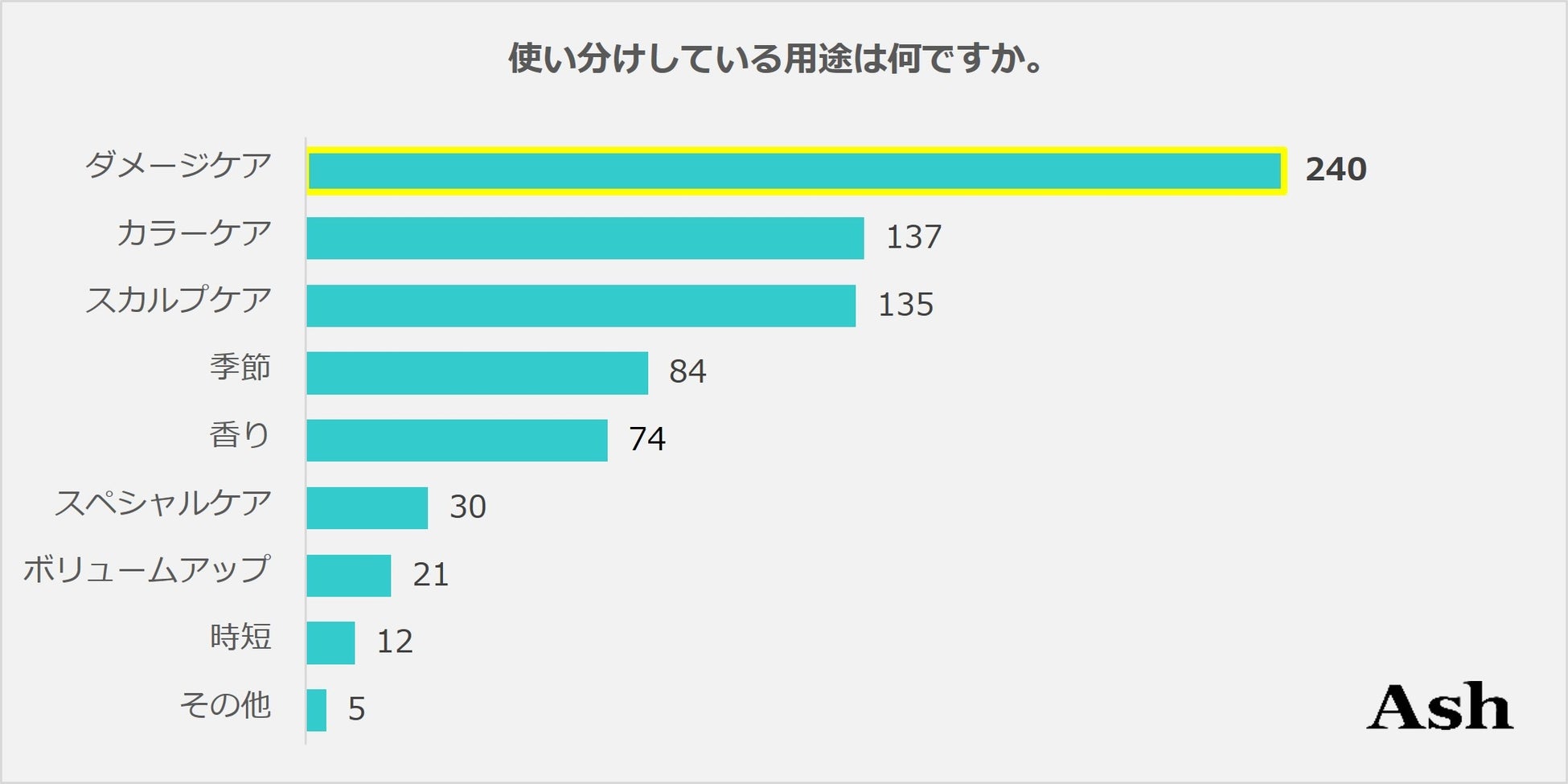 使い分けをしている種類は「2種類」が最も多く、62.3%ととなりました。中には、6種類以上も使い分けている上級者もいました。使い分けする用途の多くは「ダメージケア」が圧倒的の240名でした。続いて「カラーケア」「スカルプケア」が僅差で選ばれました。ハイトーンカラーをしている方が多いことやスカルプケアに熱心な美容師が多い中、乾燥や夏の嫌なべたつきなど「季節」に特化したシャンプーを使用していたり、その時の気分によって「香り」で使い分けしていたりすることもわかりました。