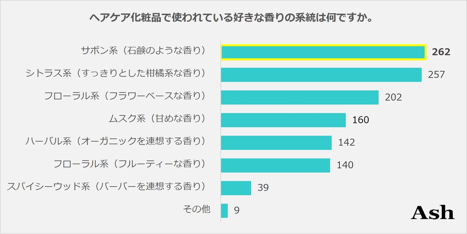 設問6でシャンプーの使い分けに「香り」を選ぶ美容師がいたように、一般消費者もヘアケア化粧品の香りは重視しています。そこで、どのような香りが人気が高いのか、アンケートをしました。