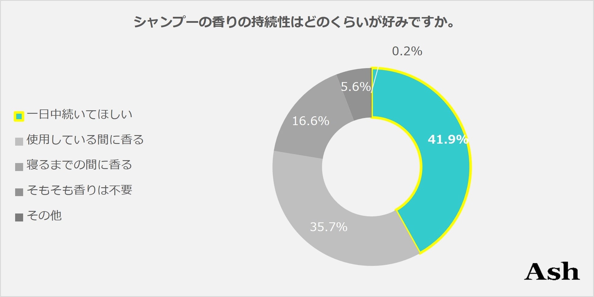 シャンプーの香りも重視している美容師が多くいることがわかりましたが、香りの持続性の好みについても調査しました。第1位は「一日中続いてほしい」が最も多く41.9%となりました。好きな香りが一日中続くことでモチベーションを保っているそうです。続いて第2位は「使用している間に香る」、第3位は「寝るまでの間に香る」となり、朝には香りがなくなるけれども使用感はほしいとい感じる方が半数を超えました。一方で「そもそも香りは不要」が5.6%で、香りよりも成分や仕上がりなどを重視している美容師は一定数いることがわかりました。香りの好みはさまざまですが、持続性は長時間派・短時間派にわかれるようです。