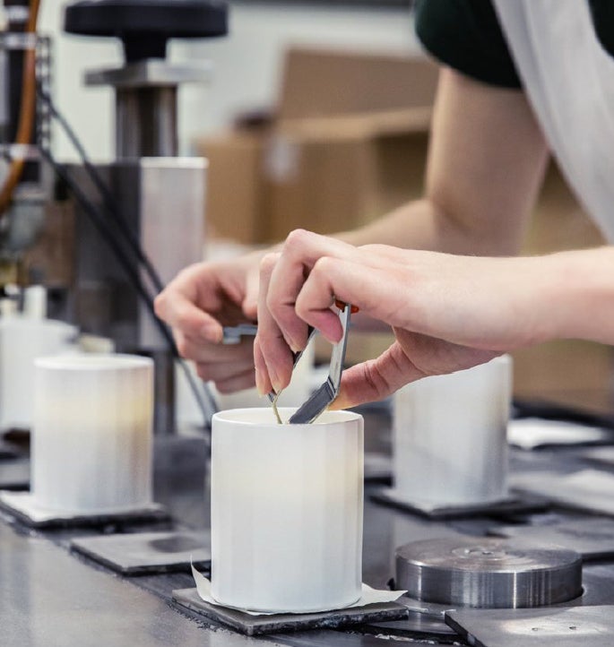 ウィック(芯)を垂直に落とし、中心に位置を整えた後、燃焼に最適な高さにトリミングされています。手作業なくしては実現することのできない工程を経て、製品化されています。