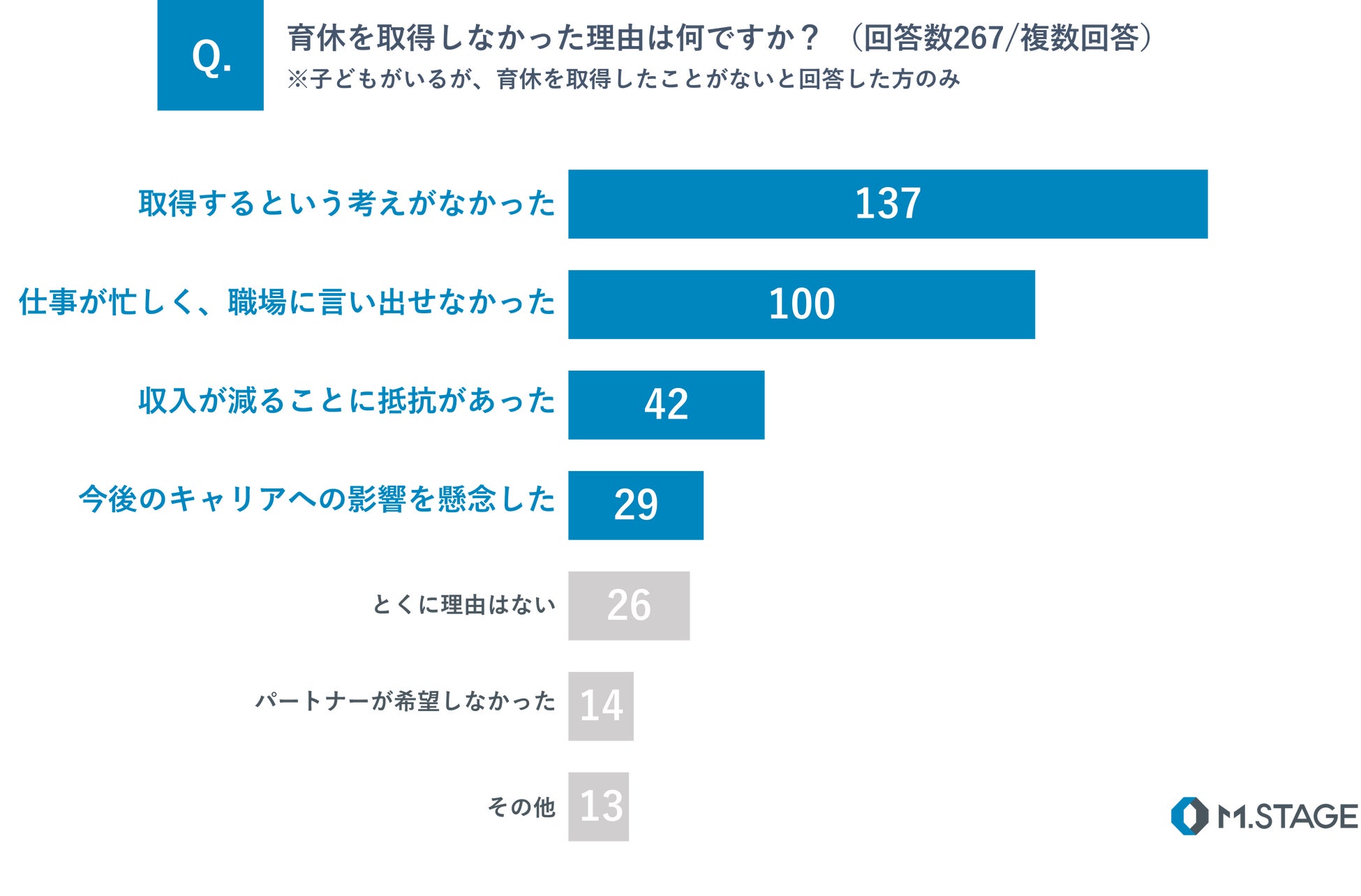 子どもがいるが、育休を取得しなかった理由について、「取得するという考えがなかった」(137)が最も多く、次いで「仕事が忙しく、職場に言い出せなかった」(100)、「収入が減ることに抵抗があった」(42)、「今後のキャリアへの影響を懸念した」(29)が続く結果となりました。