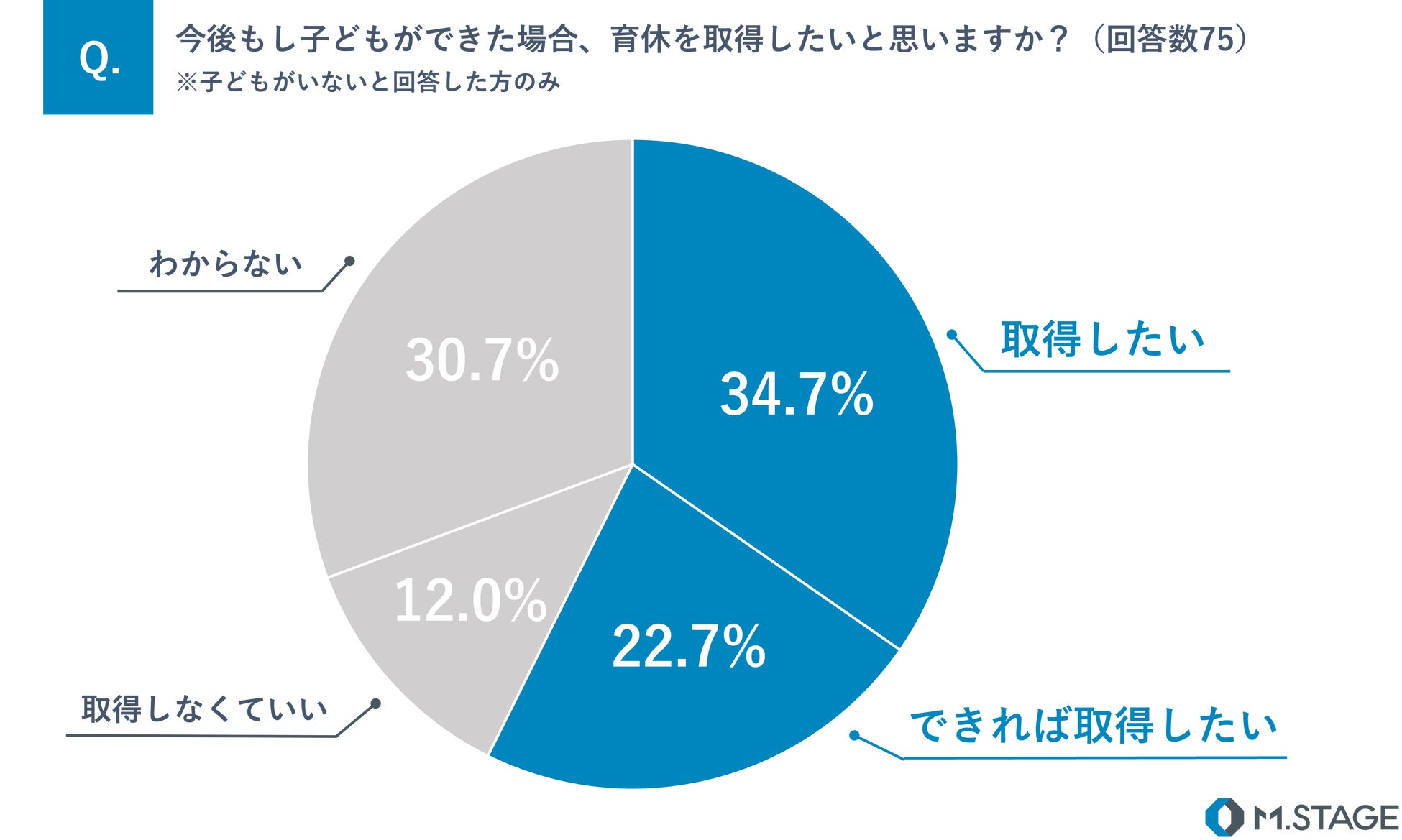 今後子どもができた場合、育休を「取得したい」と回答した医師は 34.7%、「できれば取得したい」と回答した医師は 22.7%となり、男性医師の 2 人に 1 人以上は今後育休を取得したいという意向がある結果となりました。